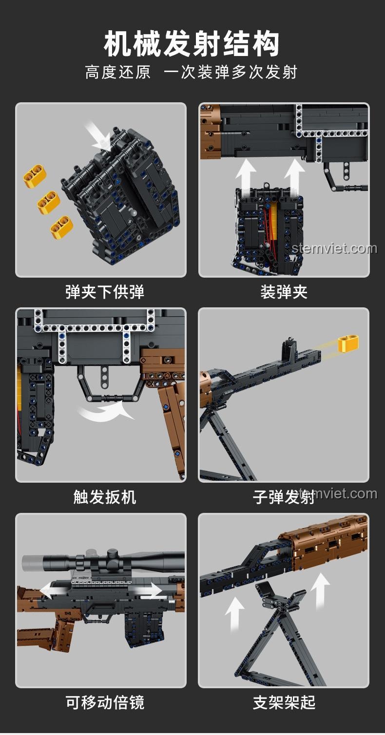Điểm nhấn nổi bật nhất của đồ chơi mô hình Súng trường bắn tỉa SVD 670005 chính là khả năng bắn đạn nhựa chân thực, mang lại trải nghiệm chơi đầy kịch tính và hấp dẫn. Bé có thể tự tay nạp đạn vào băng đạn, kéo cò và ngắm bắn như một xạ thủ thực thụ. Đặc biệt, kính ngắm của súng có thể điều chỉnh được, giúp bé rèn luyện khả năng nhắm mục tiêu và tăng cường độ chính xác trong mỗi lần bắn. Cơ chế nạp đạn bằng băng đạn và chân chống có thể gập mở linh hoạt càng làm tăng tính chân thực và khả năng tương tác của mô hình. Với hơn 1600 mảnh ghép, đây không chỉ là một đồ chơi mô hình 670005 thông thường mà còn là một thử thách lắp ráp thú vị, giúp bé khám phá cấu trúc cơ khí phức tạp và nguyên lý hoạt động của súng. Bé sẽ được trải nghiệm cảm giác như một kỹ sư thực thụ khi hoàn thành tác phẩm này.