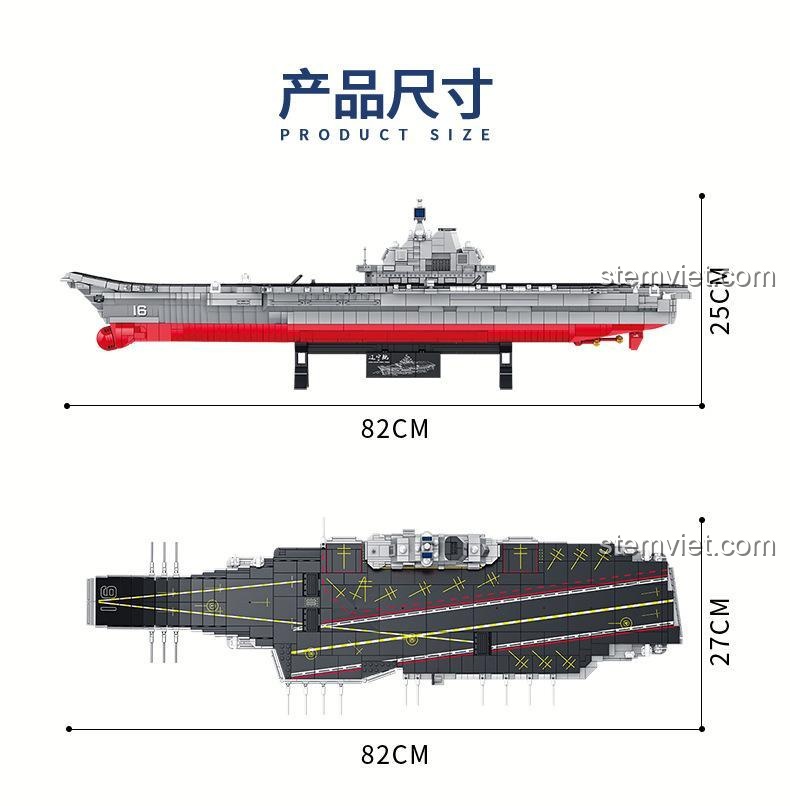 Mô hình đồ chơi Panlos Brick 688011 Tàu Sân Bay Liêu Ninh là một minh chứng cho sự tỉ mỉ và tinh xảo trong thiết kế. Với chiều dài ấn tượng 82cm, chiều rộng 27cm và chiều cao 25cm, đây thực sự là một mô hình khổng lồ, tái hiện chân thực tỷ lệ và hình dáng của tàu sân bay Liêu Ninh ngoài đời thực. Màu sắc chủ đạo là xám và đen, kết hợp với các chi tiết đỏ và trắng, tạo nên vẻ ngoài mạnh mẽ, uy nghi đúng chất một chiến hạm.