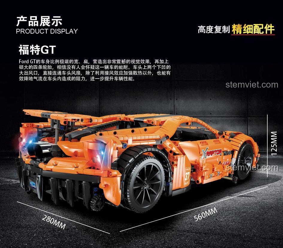 Điểm nhấn của mô hình Xe thể thao Ford GT Qizhile này chính là các chi tiết thẩm mỹ được chăm chút kỹ lưỡng. Từ lưới tản nhiệt phía trước, cụm đèn pha sắc nét, đến bộ vành xe thể thao và cánh gió sau hầm hố, tất cả đều được tái hiện một cách chân thực. Kích thước mô hình sau khi lắp ráp là dài 56cm, rộng 28cm và cao 12.5cm, mang lại một tỷ lệ ấn tượng, đủ lớn để trưng bày và đủ chi tiết để khám phá. Bé sẽ được chiêm ngưỡng một siêu xe thu nhỏ hoàn hảo, từ mọi góc độ.