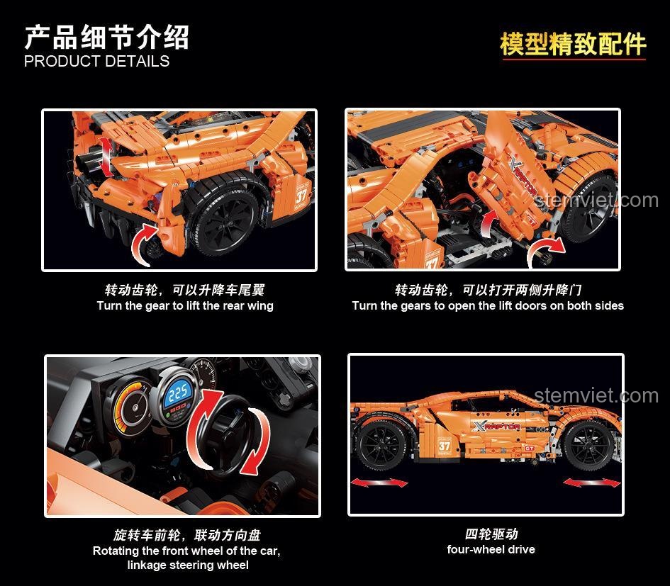 Các tính năng cơ bản bao gồm: hệ thống vô lăng liên kết với bánh trước, cho phép bé điều khiển hướng di chuyển của xe một cách linh hoạt; hệ dẫn động bốn bánh (4WD) giúp xe vận hành mượt mà và ổn định trên nhiều bề mặt. Đặc biệt, mô hình Qizhile 23013 Ford GT còn sở hữu những tính năng đặc biệt ấn tượng như: khả năng nâng hạ cánh gió sau chỉ bằng một thao tác xoay bánh răng, tạo hiệu ứng khí động học chân thực; và cửa xe mở kiểu cánh chim độc đáo, tái hiện hoàn hảo thiết kế mang tính biểu tượng của Ford GT.