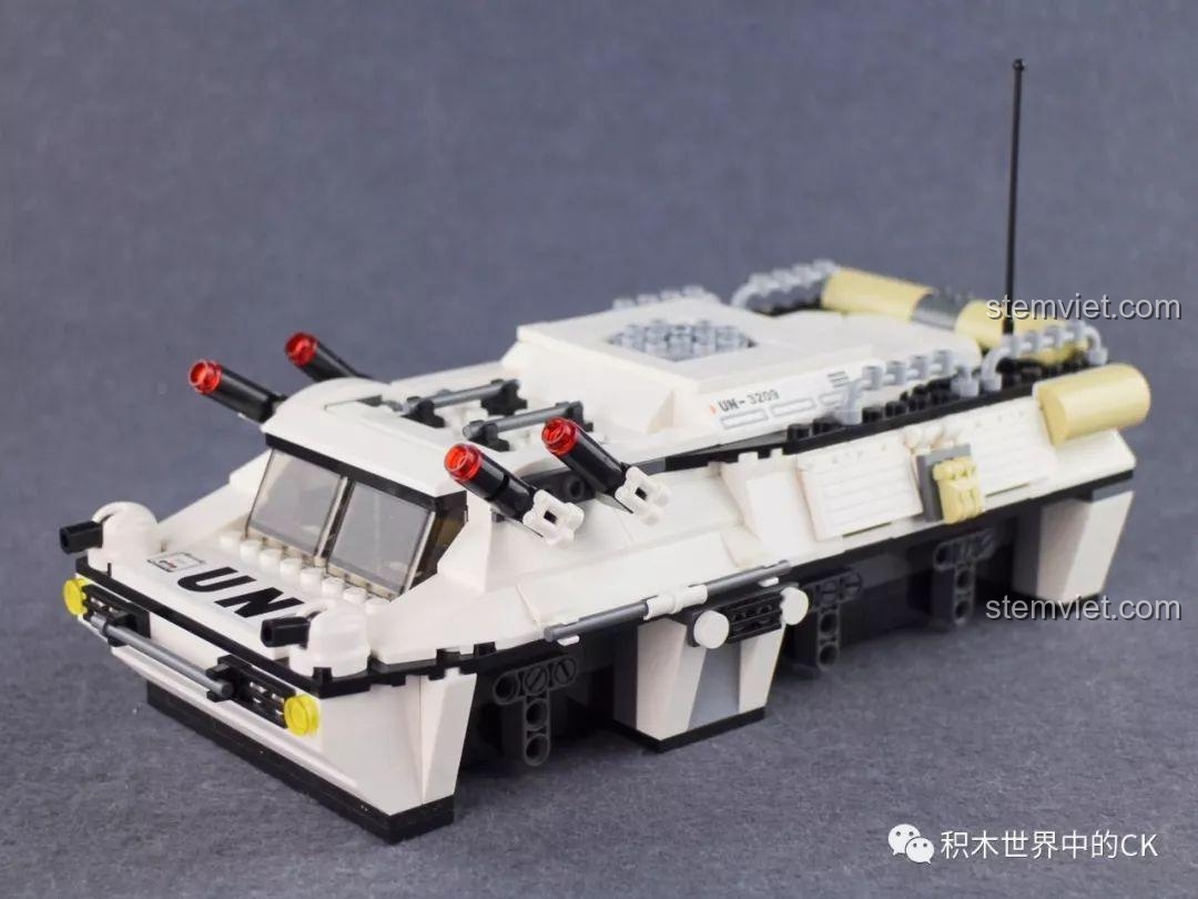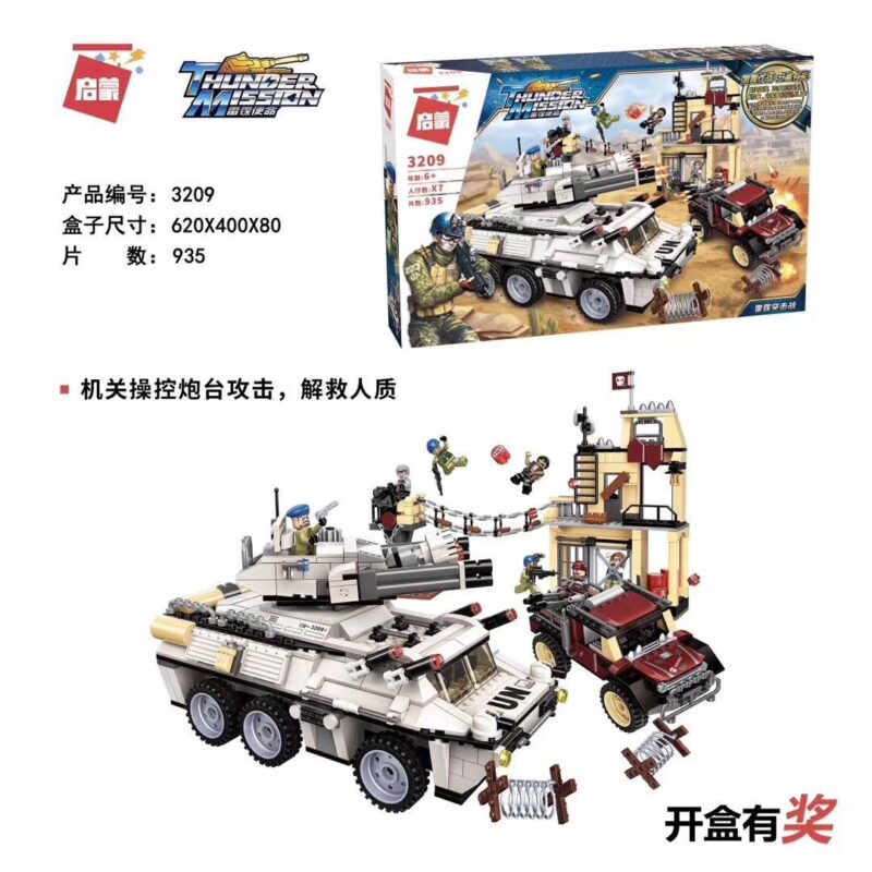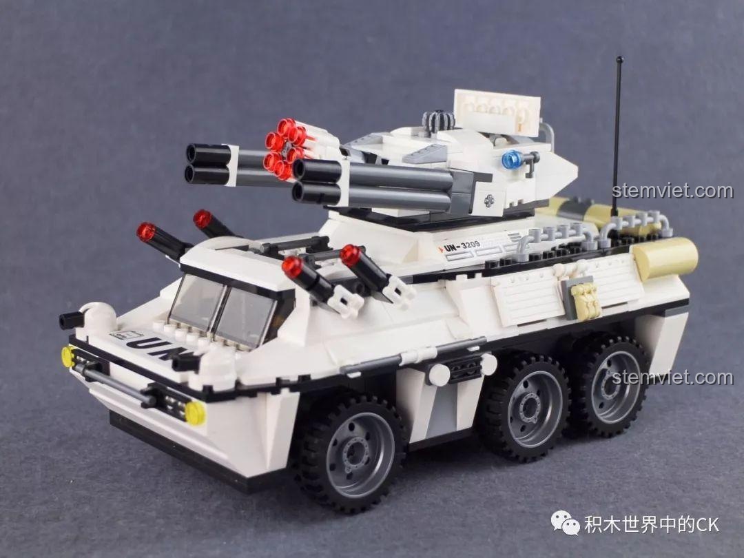 Chiếc xe bọc thép có tháp pháo xoay 360 độ và có thể bắn đạn nhựa. Ngoài ra, cửa xe và các tấm giáp sườn cũng có thể mở ra, giúp bé dễ dàng tương tác và chơi nhập vai với Căn Cứ Quân Sự Enlighten-3209.