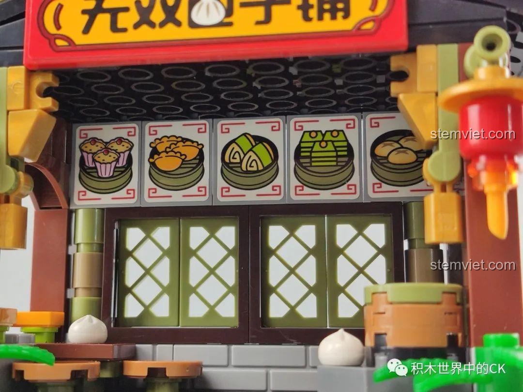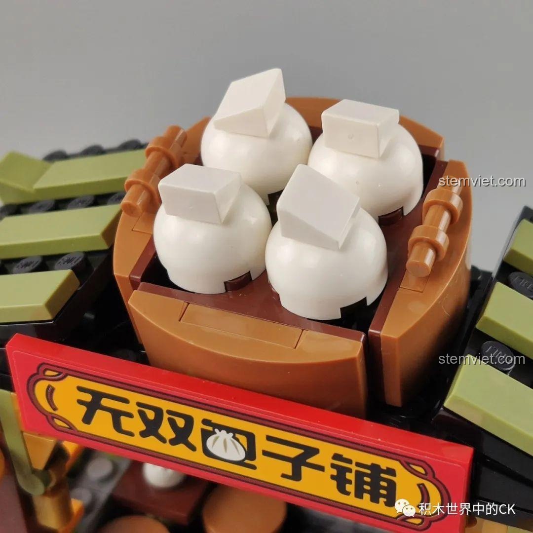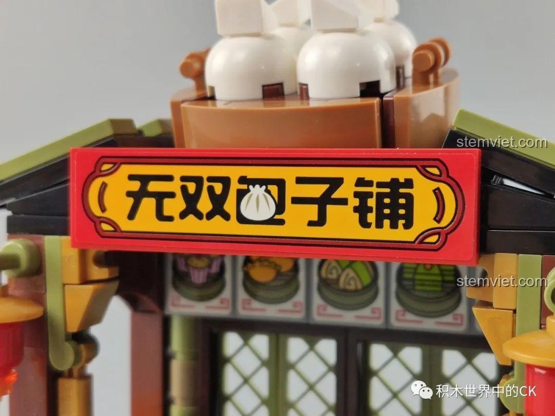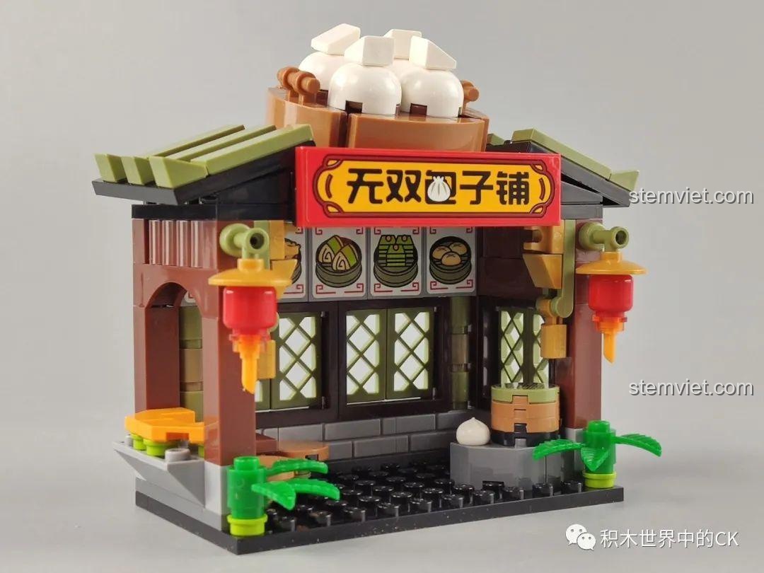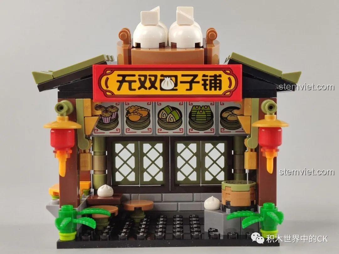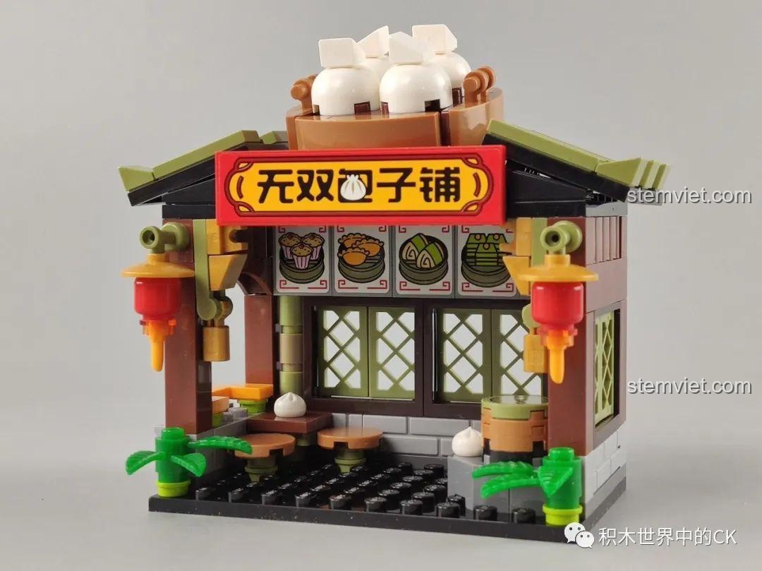 Mỗi chi tiết trong set đồ chơi Cửa hàng ẩm thực Mini World này đều được chăm chút tỉ mỉ, từ những chiếc đèn lồng đỏ treo trước cửa, biển hiệu “Vô Song Baozi Shop” nổi bật, cho đến những khay bánh bao trắng muốt trên mái nhà và quầy hàng. Đặc biệt, minifigure Yue Wushuang được thiết kế vô cùng đáng yêu với trang phục truyền thống và mái tóc búi đặc trưng, sẵn sàng chào đón khách hàng. Các cửa sổ với họa tiết ô vuông và những chậu cây xanh nhỏ xinh càng làm tăng thêm vẻ đẹp và sự chân thực cho mô hình. Đây không chỉ là một món đồ chơi mà còn là một tác phẩm nghệ thuật thu nhỏ, thể hiện sự khéo léo và tinh tế trong từng mảnh ghép.