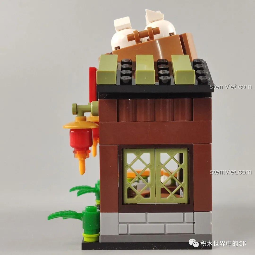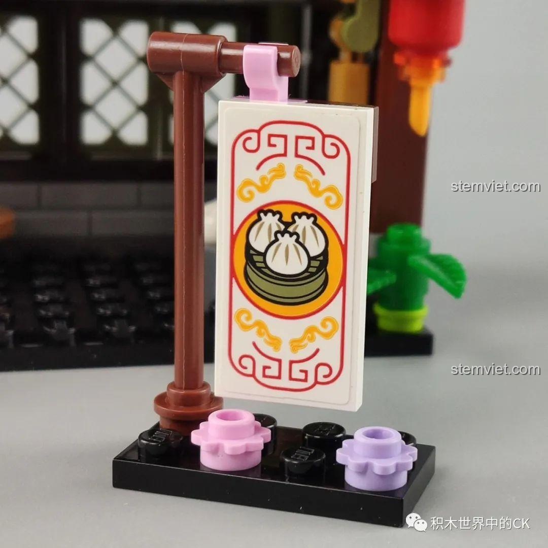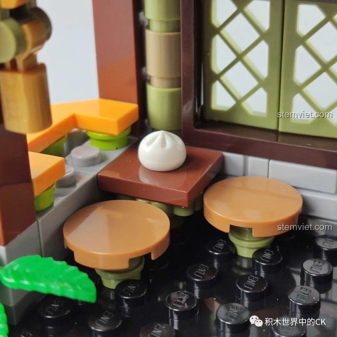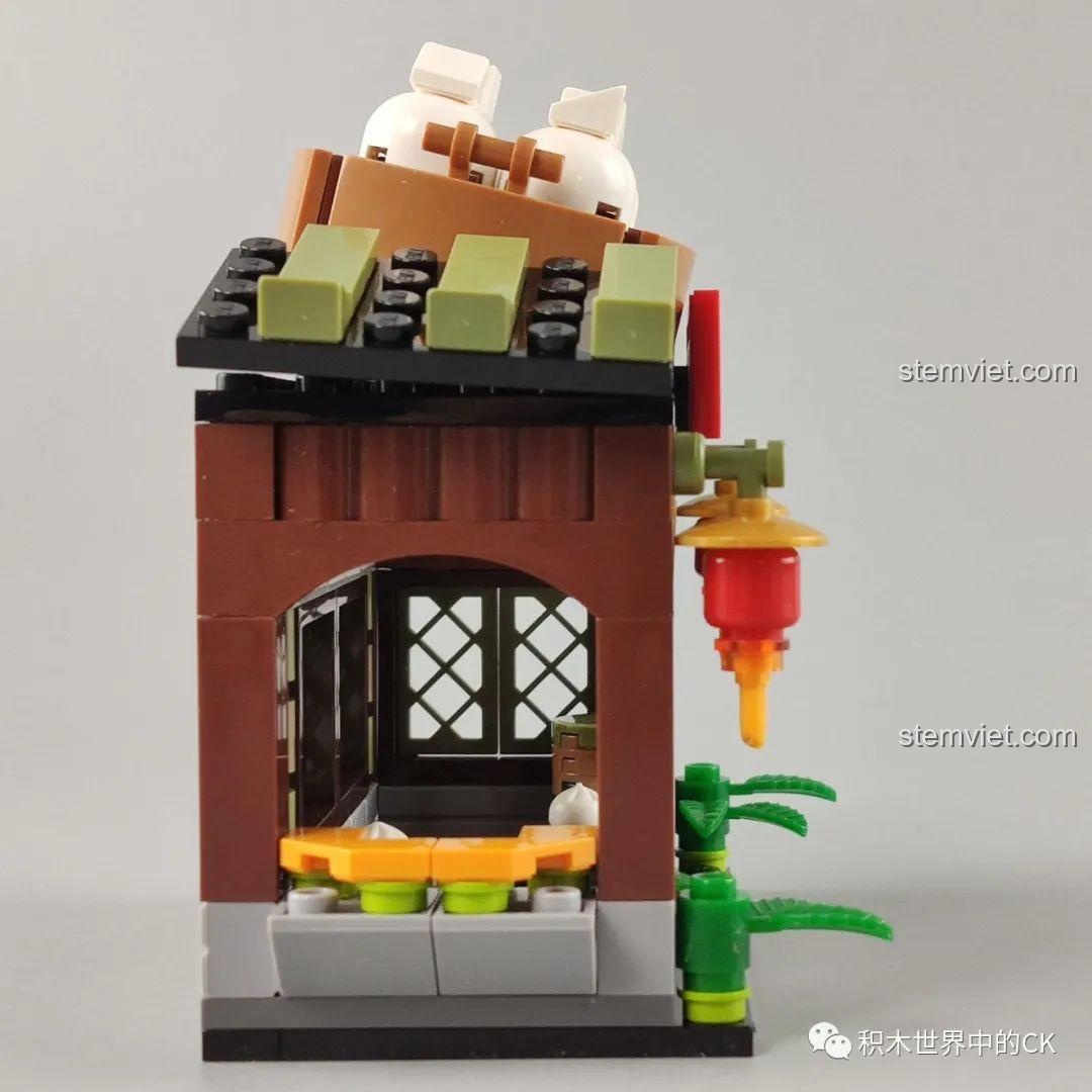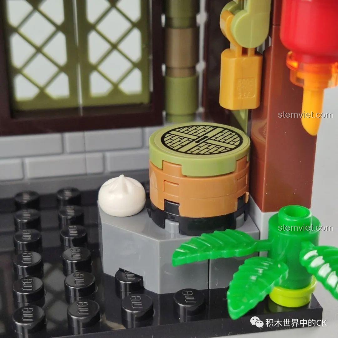Mỗi chi tiết trong set đồ chơi Cửa hàng ẩm thực Mini World này đều được chăm chút tỉ mỉ, từ những chiếc đèn lồng đỏ treo trước cửa, biển hiệu “Vô Song Baozi Shop” nổi bật, cho đến những khay bánh bao trắng muốt trên mái nhà và quầy hàng. Đặc biệt, minifigure Yue Wushuang được thiết kế vô cùng đáng yêu với trang phục truyền thống và mái tóc búi đặc trưng, sẵn sàng chào đón khách hàng. Các cửa sổ với họa tiết ô vuông và những chậu cây xanh nhỏ xinh càng làm tăng thêm vẻ đẹp và sự chân thực cho mô hình. Đây không chỉ là một món đồ chơi mà còn là một tác phẩm nghệ thuật thu nhỏ, thể hiện sự khéo léo và tinh tế trong từng mảnh ghép.