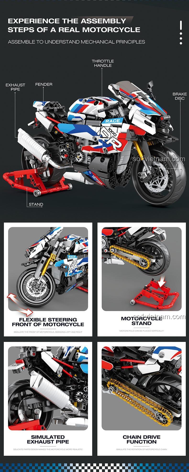 Không chỉ dừng lại ở vẻ ngoài ấn tượng, Mô hình Xe Mô tô BMW M1000RR Reobrix còn tích hợp nhiều tính năng cơ khí chân thực, mang đến trải nghiệm lắp ráp và chơi đầy thú vị. Điểm nhấn phải kể đến là hệ thống lái linh hoạt, cho phép người chơi điều khiển bánh trước như một chiếc mô tô thật. Chức năng truyền động xích được mô phỏng chi tiết, kết nối bánh sau với động cơ, giúp người chơi hiểu rõ hơn về cơ chế vận hành của xe. Ống xả mô phỏng không chỉ tăng tính thẩm mỹ mà còn có thể tạo ra âm thanh cơ khí sống động (nếu có bộ phận cơ khí tích hợp). Ngoài ra, mô hình còn đi kèm chân chống có thể dựng, giúp bạn dễ dàng trưng bày tác phẩm của mình. Đây là một đồ chơi xây dựng không chỉ để ngắm mà còn để khám phá và tương tác.