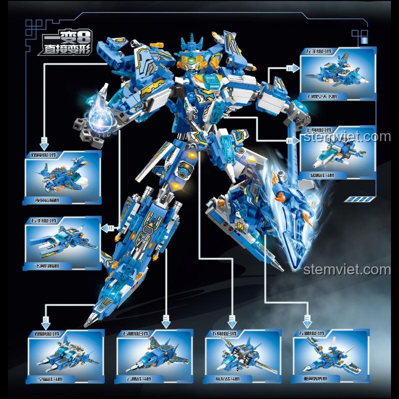 Điểm nhấn nổi bật nhất của bộ Robot Triệu Vân 335 này chính là khả năng biến hình ấn tượng thành 8 kiểu khác nhau! Từ một cỗ máy chiến đấu khổng lồ, bé có thể biến đổi thành máy bay chiến đấu, xe chiến đấu, phi thuyền, xe địa hình, xe phóng tên lửa, xe vận tải và xe trinh sát. Mỗi dạng biến hình đều có thiết kế độc đáo và chức năng riêng biệt, mở ra vô vàn kịch bản chơi sáng tạo và không giới hạn.