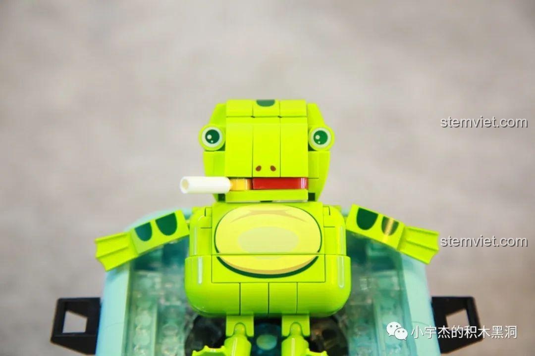 Ngay từ cái nhìn đầu tiên, Mô hình ếch hài hước Sembo 613103 đã gây ấn tượng mạnh với thiết kế vô cùng độc đáo và chi tiết. Chú ếch màu xanh lá cây nổi bật, đang nằm thư giãn trong một chiếc nồi lẩu màu xanh dương nhạt, đặt trên một chiếc bếp ga mini màu vàng và xanh lá. Kích thước mô hình sau khi lắp ráp là 12.2 cm chiều dài, 10.3 cm chiều rộng và 10.4 cm chiều cao, rất vừa vặn để trưng bày trên bàn học, kệ sách hay bất cứ không gian nào.