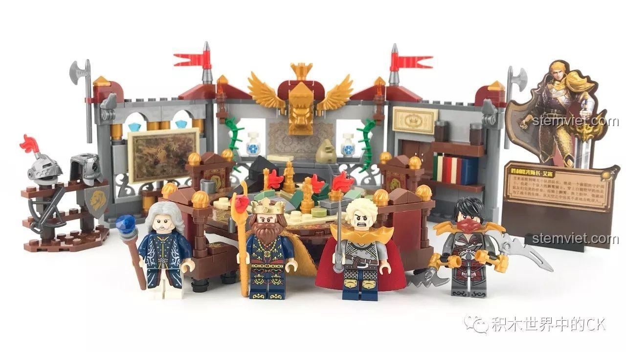 Bộ lắp ráp SEMBO SD3352 Hội Nghị Chiến Lược Thánh Quang Diệt Tộc U Minh gây ấn tượng mạnh mẽ với thiết kế vô cùng tinh xảo và chân thực. Với 439 mảnh ghép, mỗi chi tiết đều được chăm chút tỉ mỉ, từ những viên gạch màu xám vững chãi của bức tường lâu đài, sắc nâu ấm áp của bàn hội nghị và ghế, đến điểm nhấn vàng óng ánh của vương miện Quốc Vương và các chi tiết trang trí. Mô hình tái hiện một không gian hội nghị hoàng gia đầy uy nghi với bàn tròn trung tâm, nơi các minifigures Quốc Vương, Đội Trưởng Ánh Sáng Amy, Thánh Pháp Sư Miren và Kẻ Lẻn Lút Credo cùng nhau vạch ra chiến lược. Các chi tiết in ấn chất lượng cao trên ghế, bàn và bản đồ làm tăng thêm vẻ sang trọng và chân thực cho cảnh quan. Dù không có kích thước mô hình cụ thể, nhưng qua hình ảnh, có thể thấy đây là một cảnh quan đủ lớn để bé có thể tương tác và sắp đặt các nhân vật, tạo nên những câu chuyện phong phú. Đây là bộ đồ chơi mô hình Bàn Tròn Chiến Lược hoàn hảo để trưng bày và chơi.