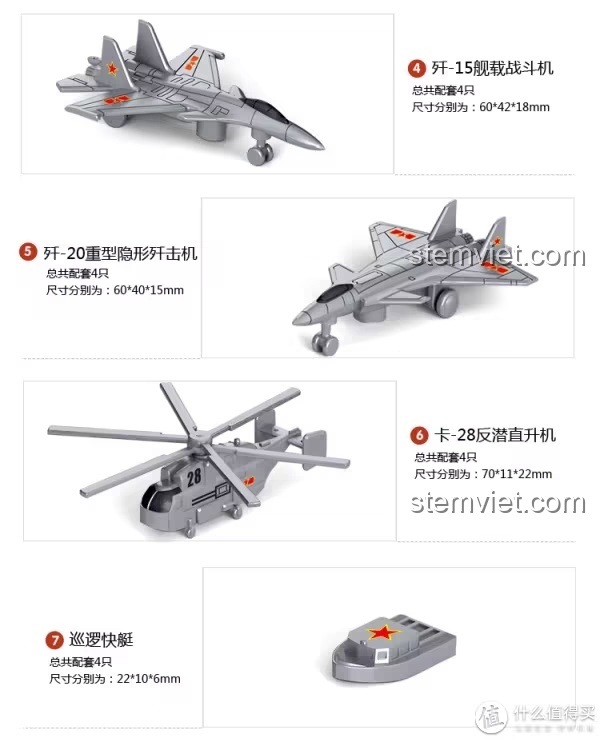 Có chứ! Bộ sản phẩm đi kèm đầy đủ các phương tiện và phụ kiện để tăng tính chân thực và khả năng chơi. Bao gồm 4 tiêm kích J-15, 4 tiêm kích tàng hình J-20, 4 trực thăng chống ngầm Ka-28 và 4 xuồng tuần tra. Ngoài ra còn có dụng cụ tháo gỡ và bộ decal dán để hoàn thiện mô hình Tàu Sân Bay Liêu Ninh.