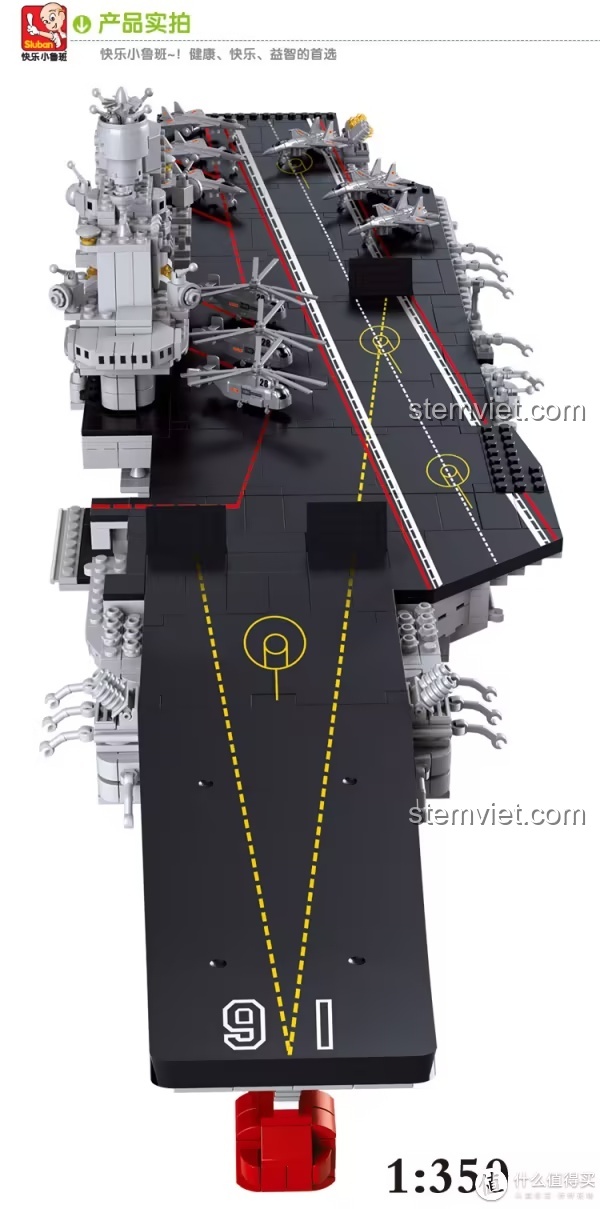 Mô hình Tàu Sân Bay Liêu Ninh Sluban M38-B0388 không chỉ là một đồ chơi, mà là một tác phẩm nghệ thuật thu nhỏ! Với chiều dài ấn tượng 89cm, chiều rộng 21cm và chiều cao 22cm, mô hình này tái hiện chân thực tàu sân bay Liêu Ninh với tỉ lệ 1:350. Màu sắc chủ đạo Đen, Xám và Đỏ được phối hợp hài hòa, tạo nên vẻ ngoài mạnh mẽ và uy nghi. Từng chi tiết nhỏ nhất trên boong tàu, từ đường băng cất cánh, khu vực hạ cánh, đến tháp chỉ huy đồ sộ, đều được tái hiện một cách tỉ mỉ. Đặc biệt, bộ đồ chơi mô hình này còn đi kèm với 4 tiêm kích J-15, 4 tiêm kích tàng hình J-20, 4 trực thăng chống ngầm Ka-28 và 4 xuồng tuần tra, giúp bé tái hiện những cảnh tượng sống động trên biển. Hệ thống phòng thủ tầm gần (CIWS) và hệ thống tên lửa phòng không cũng được mô phỏng, tăng thêm tính chân thực cho mô hình. Đây chắc chắn sẽ là điểm nhấn nổi bật trong bộ sưu tập của bất kỳ bé trai nào đam mê quân sự.