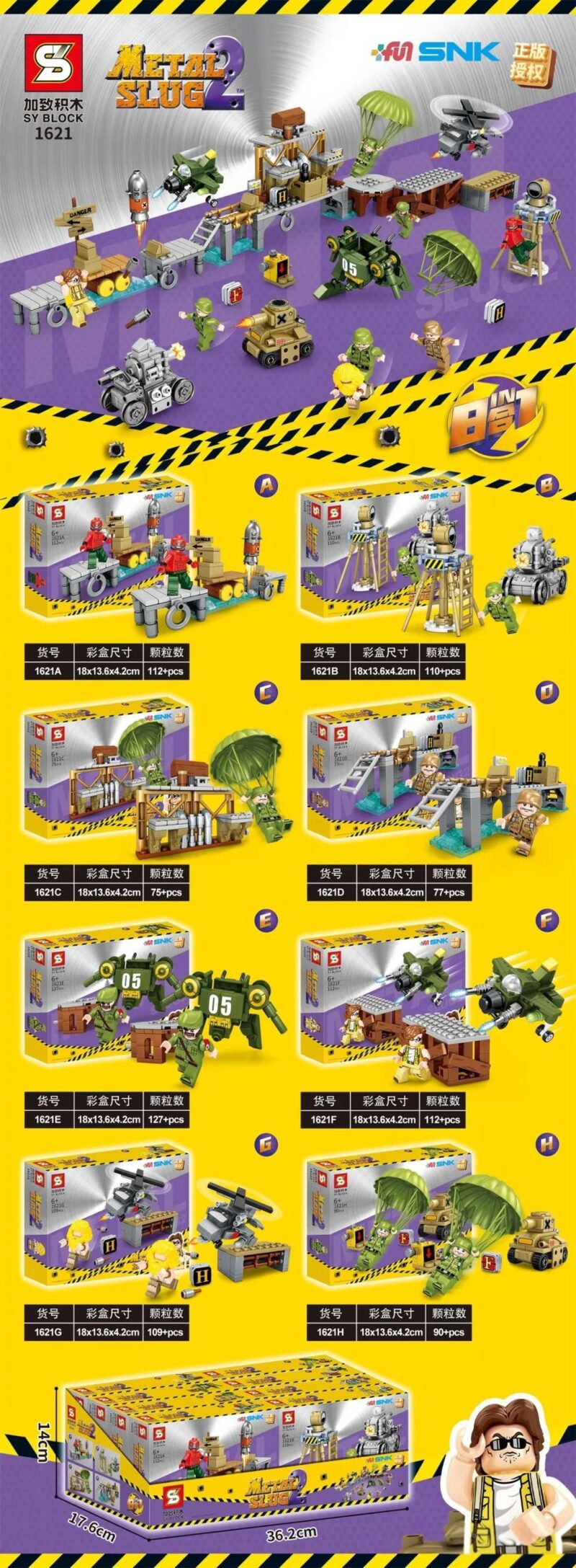 Bộ lắp ráp SY 1621C Metal Slug 2 gây ấn tượng mạnh mẽ với thiết kế chi tiết và màu sắc chủ đạo là xanh lá, xám, nâu, vàng và đỏ, tái hiện hoàn hảo không khí chiến trường. Với tổng cộng 812 mảnh ghép, bộ đồ chơi này cho phép bé lắp ráp thành 8 mô hình khác nhau, mỗi mô hình đều có những đặc điểm riêng biệt và độ chân thực cao. Từ những chiếc xe tăng mini hầm hố, máy bay chiến đấu linh hoạt, trực thăng trinh sát, cho đến pháo đài kiên cố và tháp canh vững chắc, mỗi chi tiết đều được chăm chút tỉ mỉ.