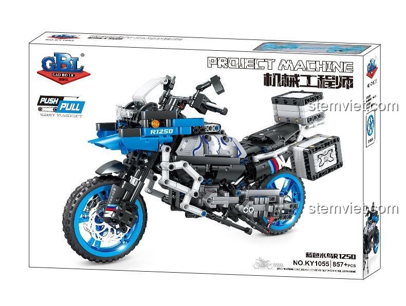Bộ lắp ráp xe máy BMW R1250 GBL KY1055 có 857 mảnh ghép, tái hiện chân thực chiếc xe mô tô BMW R1250 với các tính năng như bánh xe có thể quay, hệ thống treo trước và sau, bánh trước có thể lái và chân chống có thể gập lại. Mô hình được làm từ nhựa ABS cao cấp, đảm bảo độ bền và an toàn.