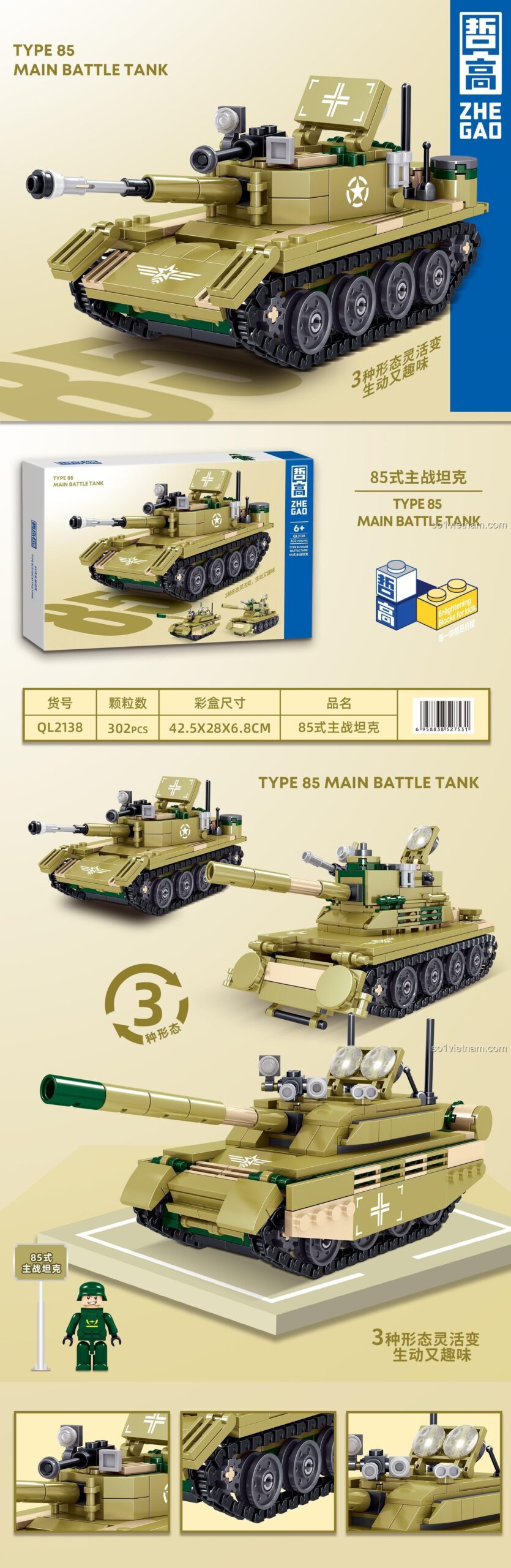 Bộ lắp ráp ZHEGAO QL2138 bao gồm 302 mảnh ghép, cho phép bé lắp ráp thành xe tăng chiến đấu chủ lực Type 85. Sản phẩm có 3 kiểu lắp ráp khác nhau, tháp pháo xoay được, pháo có thể nâng hạ và chức năng bắn đạn nhựa.