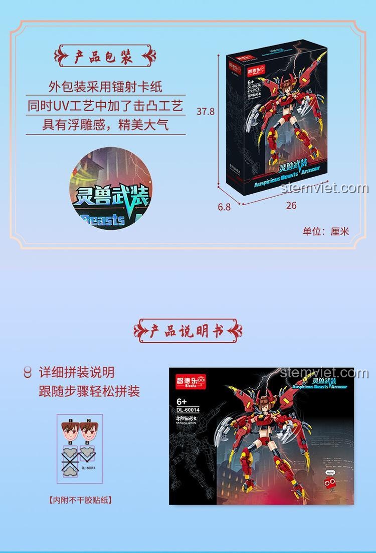 Chào mừng bạn đến với thế giới đầy mê hoặc của bộ lắp ráp Nữ chiến binh bọ hung đỏ ZDEL DL-60014! Lấy cảm hứng từ series "Auspicious Beasts Armour" (Linh Thú Vũ Trang), mô hình này không chỉ là một món đồ chơi mà còn là cánh cửa mở ra những cuộc phiêu lưu kỳ thú trong trí tưởng tượng của bé. Hãy cùng con gái 6 tuổi của bạn khám phá câu chuyện về một nữ chiến binh dũng cảm, người đã hợp nhất với sức mạnh của linh thú bọ hung đỏ, tạo nên một cỗ máy chiến đấu mạnh mẽ và đầy uy lực. Mỗi mảnh ghép của đồ chơi mô hình ZDEL DL-60014 đều chứa đựng một phần của truyền thuyết, khơi gợi niềm đam mê khám phá và sáng tạo. Đây là cơ hội tuyệt vời để bé hóa thân thành nữ anh hùng, chinh phục mọi thử thách và viết nên câu chuyện của riêng mình.