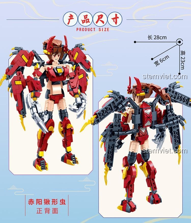 Ngay từ cái nhìn đầu tiên, bộ lắp ghép Nữ chiến binh cơ giáp bọ hung ZDEL DL-60014 đã gây ấn tượng mạnh với thiết kế độc đáo và màu sắc nổi bật. Với tông màu đỏ chủ đạo kết hợp cùng đen mạnh mẽ và điểm nhấn vàng rực rỡ, mô hình toát lên vẻ oai phong, dũng mãnh. Kích thước lý tưởng 28cm chiều dài, 6cm chiều rộng và 23cm chiều cao giúp mô hình đứng vững chãi, uy nghi trên mọi mặt phẳng. Từng chi tiết giáp trụ, cánh và móng vuốt của bọ hung đều được tái hiện tỉ mỉ, sắc nét, thể hiện sự tinh xảo trong thiết kế. Đặc biệt, các chi tiết giáp vai, giáp chân và phần cánh được thiết kế mô phỏng hình dáng của bọ hung, tạo nên một tổng thể hài hòa và ấn tượng. Đây chắc chắn sẽ là một điểm nhấn nổi bật trong bộ sưu tập của bất kỳ bé gái nào yêu thích sự mạnh mẽ và độc đáo.