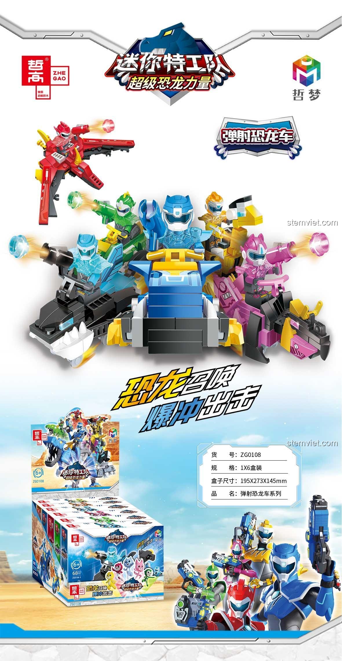 Bộ Lắp Ráp Zhe Gao ZG0108 6 Mẫu Xe Khủng Long Phóng Đạn Biệt Đội Mini Siêu Khủng Long (580 Mảnh) – Sức Mạnh Khủng Long và Bắn Đạn Nhựa