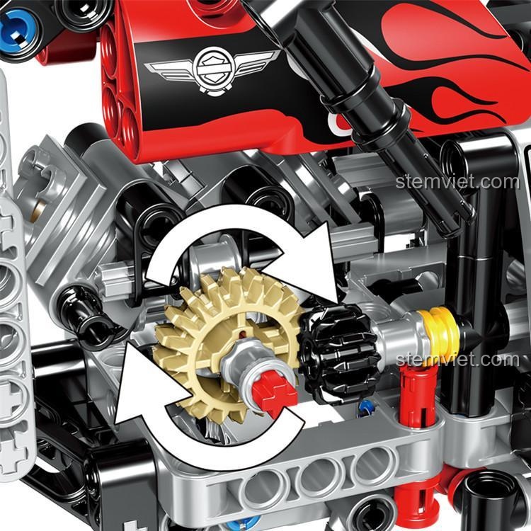 Điểm nhấn đặc biệt của bộ đồ chơi mô hình Xe máy Harley này chính là hệ thống truyền động bánh răng được thiết kế tỉ mỉ, cho phép các bánh răng chuyển động mượt mà khi xe di chuyển. Tay lái có thể điều hướng linh hoạt, mang lại cảm giác chân thực như đang điều khiển một chiếc mô tô thật. Bánh xe lớn với lốp gai hầm hố không chỉ tăng thêm vẻ ngoài mạnh mẽ mà còn đảm bảo độ bám tốt, giúp mô hình đứng vững và di chuyển ổn định. Từng chi tiết nhỏ như ống xả, giảm xóc, và đèn pha đều được chăm chút, tạo nên một mô hình hoàn hảo đến bất ngờ.