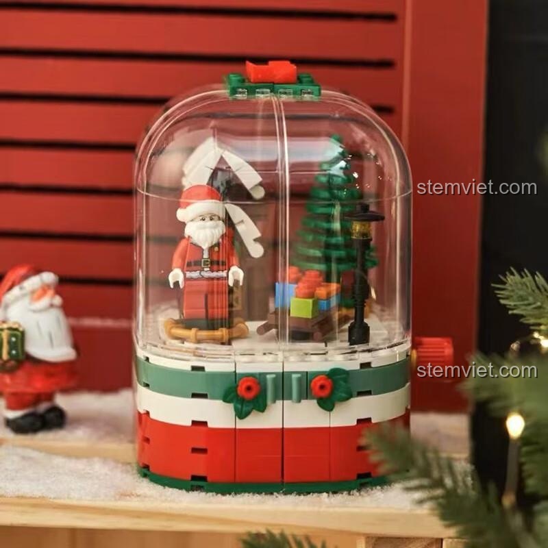 Bộ lắp ghép 0985 này gây ấn tượng mạnh mẽ với thiết kế tỉ mỉ và màu sắc chủ đạo rực rỡ: đỏ, trắng và xanh lá cây, đúng chuẩn không khí Giáng Sinh. Mô hình Ông già Noel được tạo hình đáng yêu, đứng cạnh cây thông Noel xanh mướt và một chiếc đèn đường cổ điển, tất cả được bao bọc trong một quả cầu trong suốt, tạo cảm giác như một quả cầu tuyết thu nhỏ. Kích thước mô hình sau khi hoàn thành là 12x12x16.5 cm, vừa vặn để trưng bày trên bàn học, kệ sách hay tủ đầu giường. Từng mảnh ghép của Hộp nhạc Giáng Sinh có đèn đều được chăm chút, đảm bảo độ chính xác cao, giúp bé dễ dàng lắp ráp và tạo nên một tác phẩm hoàn chỉnh, đẹp mắt. Đây không chỉ là một đồ chơi, mà còn là một vật trang trí nghệ thuật, mang đến vẻ đẹp tinh tế và không khí lễ hội cho mọi không gian.
