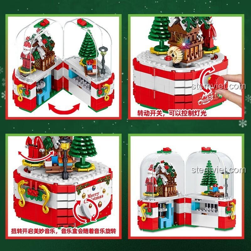 Điểm nhấn làm nên sự đặc biệt của Hộp nhạc Merry Christmas ZHEGAO QL0985 chính là những tính năng tương tác độc đáo. Chỉ cần vặn nhẹ công tắc, mô hình sẽ bừng sáng với hệ thống đèn LED rực rỡ, tạo hiệu ứng lung linh huyền ảo. Đồng thời, những giai điệu Giáng Sinh du dương sẽ vang lên, đưa bé vào không gian lễ hội đầy mê hoặc. Đặc biệt, mô hình Ông già Noel và cây thông bên trong quả cầu sẽ tự động xoay 360 độ theo điệu nhạc, mang đến trải nghiệm thị giác sống động và cuốn hút. Tính năng xoay này không chỉ làm tăng thêm vẻ đẹp của sản phẩm khi trưng bày mà còn kích thích sự tò mò và hứng thú của bé. Đồ chơi lắp ghép Ông già Noel này không chỉ là một mô hình tĩnh mà là một tác phẩm nghệ thuật đa giác quan, mang lại niềm vui bất tận cho bé và cả gia đình.