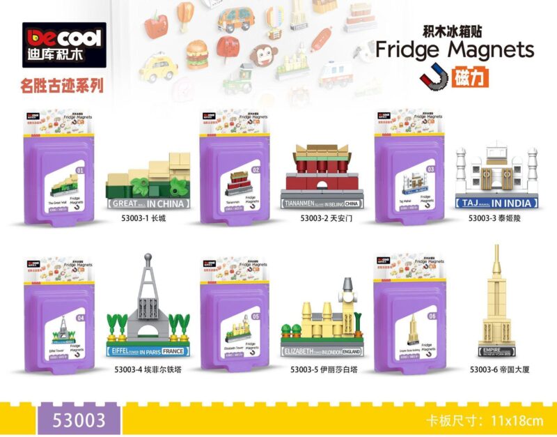 Đồ chơi lắp ráp Nam châm tủ lạnh Decool 53003 không chỉ dừng lại ở việc mang đến niềm vui lắp ráp mà còn sở hữu một tính năng đặc biệt và độc đáo: khả năng biến thành những chiếc nam châm trang trí tủ lạnh cực kỳ ấn tượng. Mỗi mô hình danh lam thắng cảnh sau khi được lắp ráp hoàn chỉnh sẽ được tích hợp nam châm ở mặt sau, cho phép bé dễ dàng gắn chúng lên bất kỳ bề mặt kim loại nào như tủ lạnh, bảng từ, hoặc các vật dụng trang trí khác trong nhà.