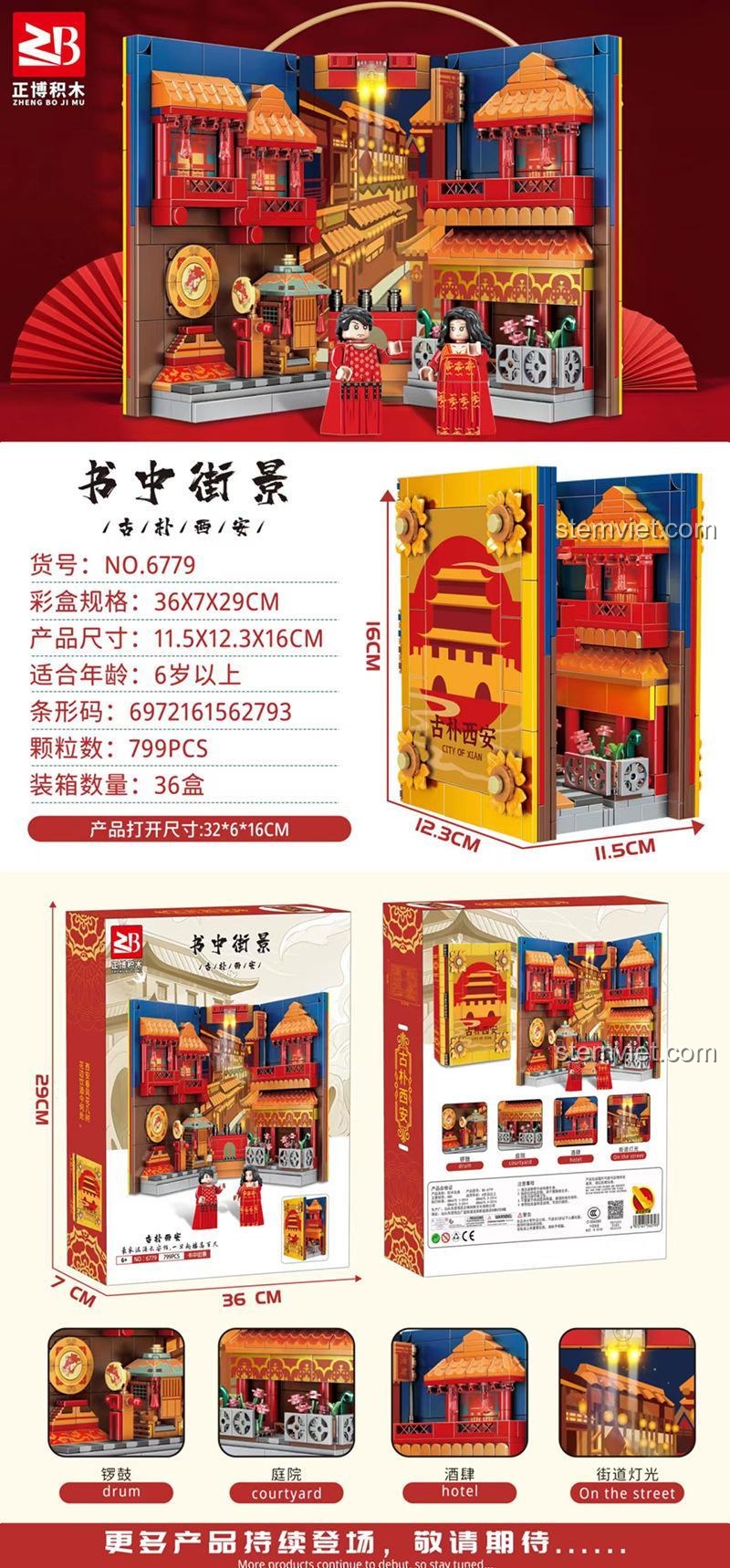 Tây An, cái tên gợi lên biết bao trang sử vàng son, nơi từng là kinh đô của 13 triều đại huy hoàng trong lịch sử Trung Hoa. Vùng đất này không chỉ nổi tiếng với Đội quân đất nung mà còn làm say đắm lòng người bởi những con phố cổ, những kiến trúc mái cong cong, những chiếc đèn lồng đỏ treo cao mang đậm dấu ấn thời gian. Bộ xếp hình Zheng Bo 6779 đã gói trọn tinh hoa ấy vào trong một thiết kế book nook thông minh. Từng chi tiết, từ lầu gác, cửa hiệu, đến những chậu hoa nhỏ xinh và hai nhân vật trong trang phục cổ trang, đều được tái hiện một cách sống động, kể cho bé nghe câu chuyện về một nền văn hóa rực rỡ. Đây là cơ hội tuyệt vời để khơi gợi cho bé niềm yêu thích lịch sử và khám phá thế giới một cách đầy sáng tạo.