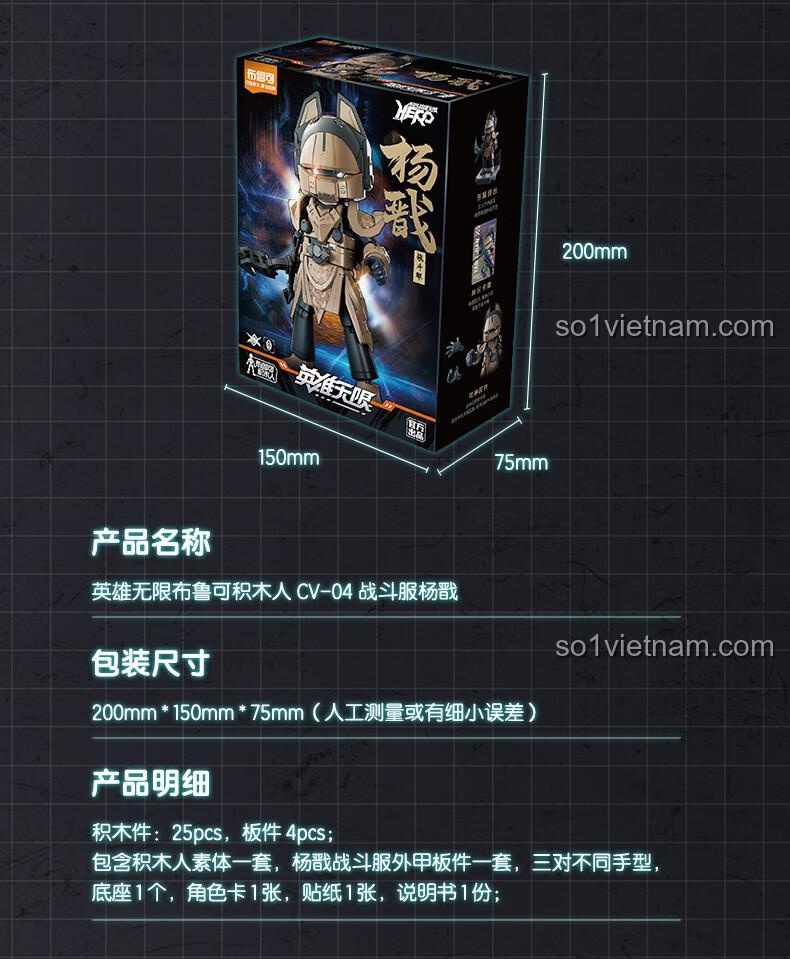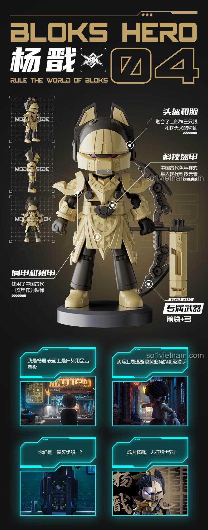 LEGO® là thương hiệu đã đăng ký của The LEGO Group. Sản phẩm Anh Hùng Vô Hạn: CV-04 Bộ Giáp Chiến Đấu Dương Tiễn của 布鲁可BLOKEES và các sản phẩm tương tự không được The LEGO Group tài trợ, ủy quyền hoặc chứng nhận. Sản phẩm của 布鲁可BLOKEES được thiết kế để tương thích với các hệ thống xếp hình khối tiêu chuẩn.