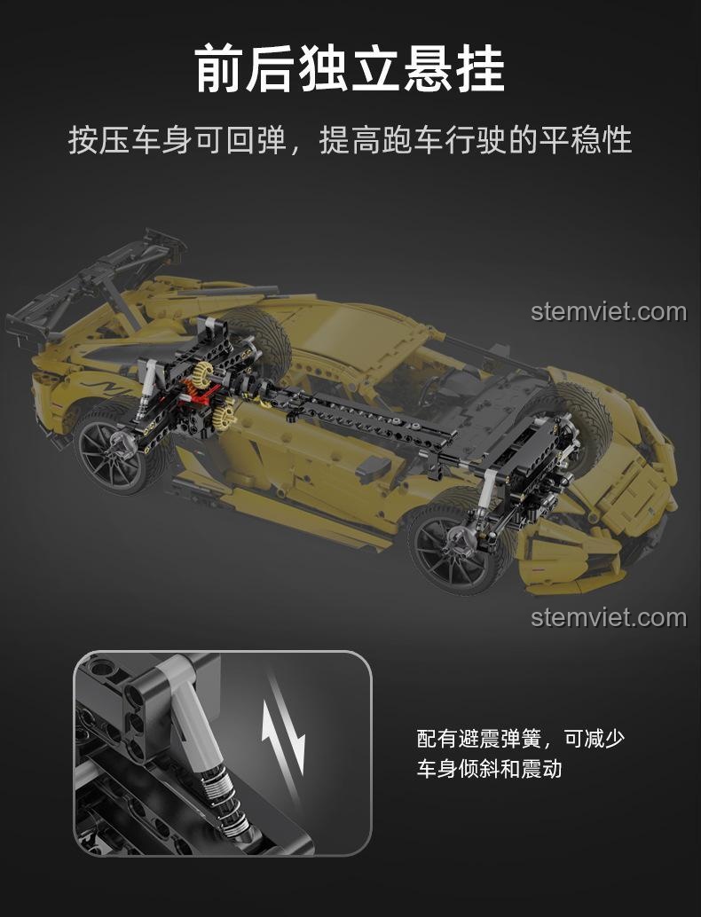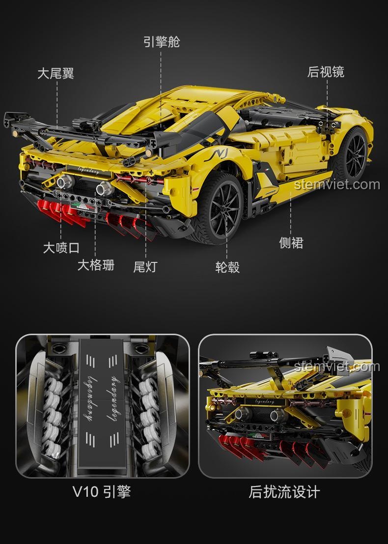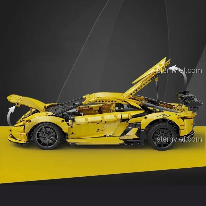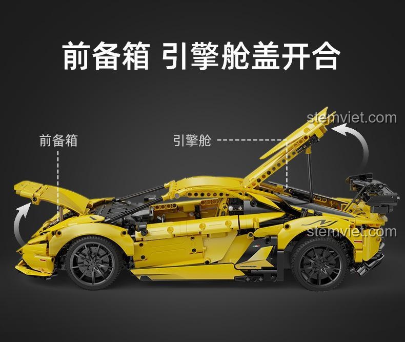 Điểm nhấn trong thiết kế của Siêu xe Lamborghini Aventador 63004 chính là các chi tiết mở được như cửa cắt kéo đặc trưng, nắp capo trước và sau, cho phép bé khám phá cấu trúc bên trong. Hệ thống treo độc lập ở cả bánh trước và sau giúp mô hình có khả năng giảm xóc, tăng tính chân thực khi di chuyển. Động cơ V10 mô phỏng được đặt ở phía sau, với các piston hoạt động liên kết khi xe chạy, mang lại trải nghiệm thị giác và cơ khí ấn tượng. Vô lăng cũng được liên kết với bánh trước, cho phép bé điều khiển hướng lái một cách linh hoạt. Tất cả những chi tiết này không chỉ làm tăng giá trị thẩm mỹ mà còn giúp bé hiểu rõ hơn về cơ chế hoạt động của một chiếc siêu xe thực thụ.