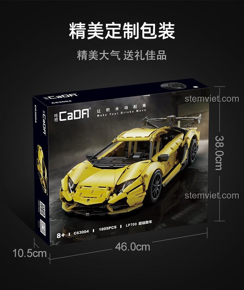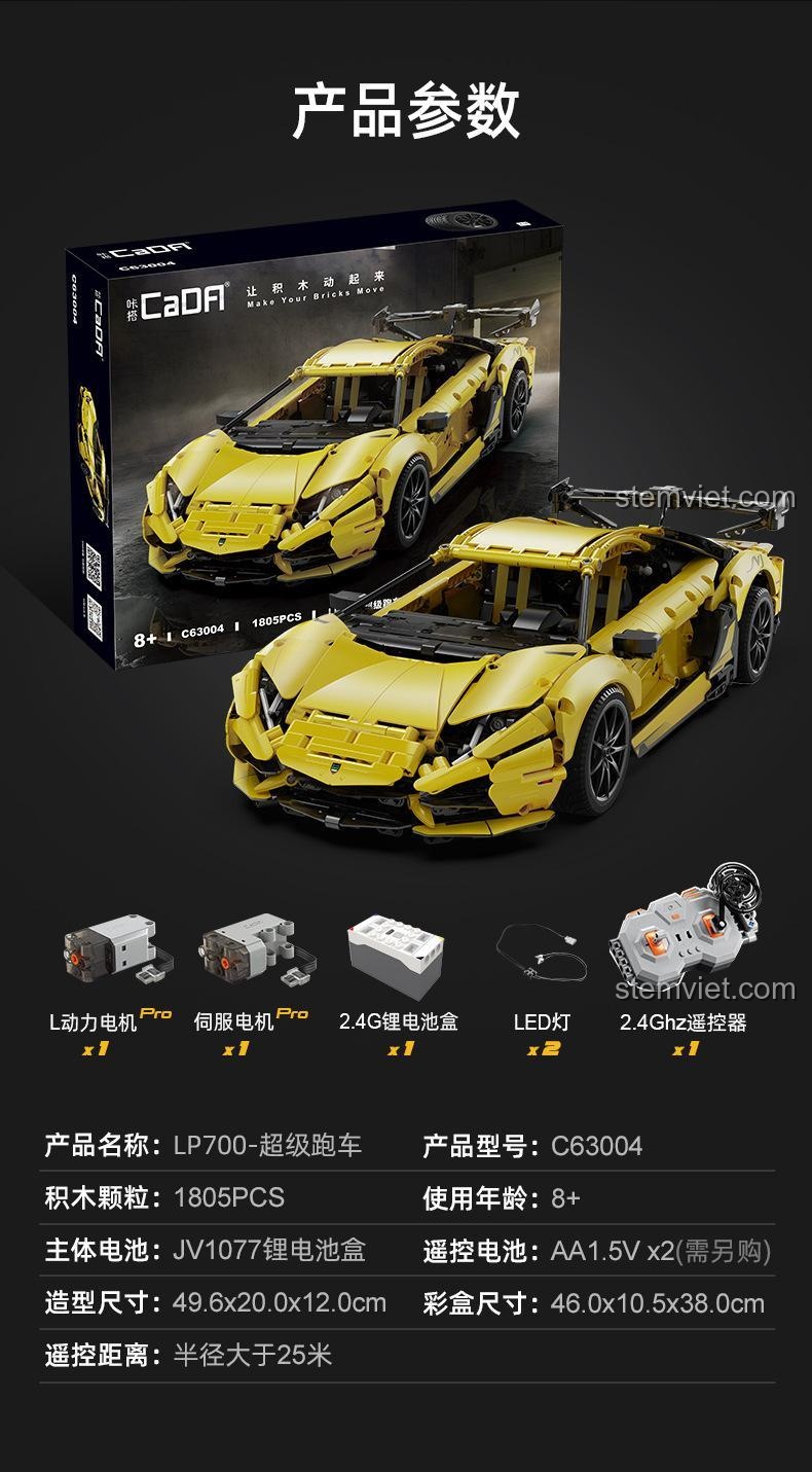 Mô hình đồ chơi lắp ráp CaDA C63004 Lamborghini Aventador LP700 được thiết kế với tỉ lệ 1:10, tái hiện một cách chân thực và sống động từng chi tiết của siêu xe thật. Với màu vàng chủ đạo kết hợp các điểm nhấn đen, chiếc xe toát lên vẻ mạnh mẽ, sang trọng và đầy cuốn hút. Kích thước mô hình sau khi hoàn thành là 49.6 cm chiều dài, 20 cm chiều rộng và 12 cm chiều cao, đủ lớn để trưng bày và đủ nhỏ để bé dễ dàng thao tác.
