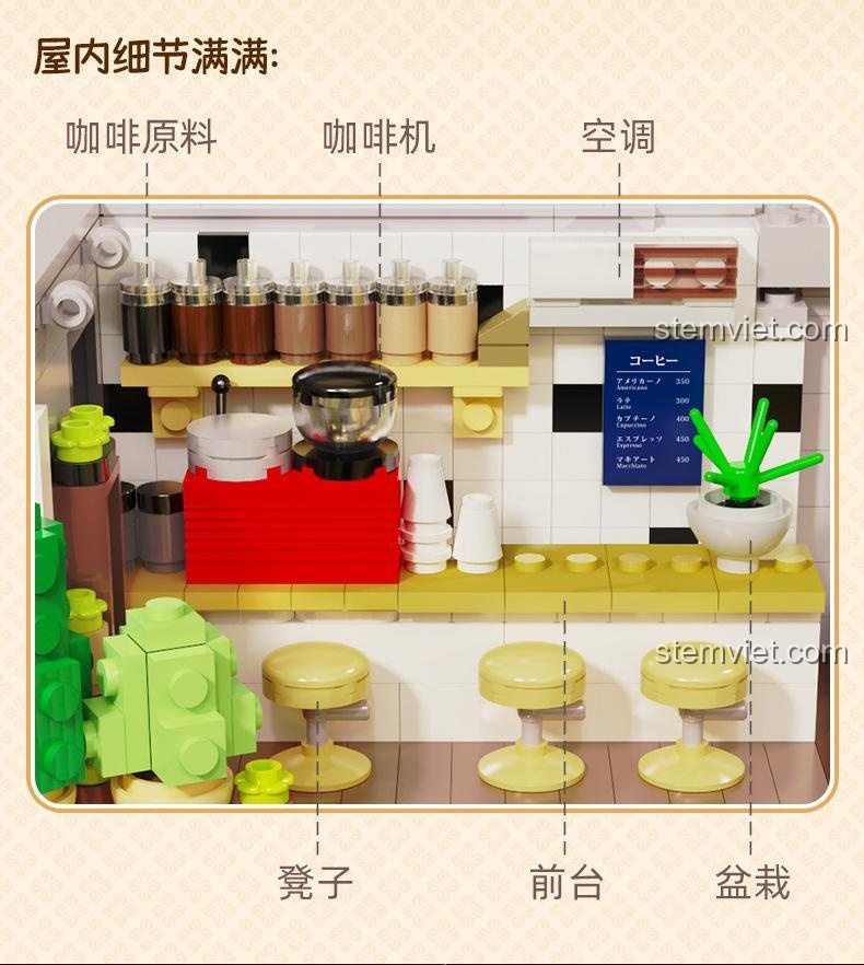 Với 1108 mảnh ghép được chế tác tỉ mỉ, Mô hình kiến trúc Nhật Bản C66007 sẽ khiến bạn phải trầm trồ trước độ chi tiết và chân thực. Từng góc nhỏ của quán cà phê đều được tái hiện một cách sống động, từ mặt tiền với mái hiên, biển hiệu chữ Nhật, dàn nóng điều hòa, cho đến những chậu cây cảnh xinh xắn. Màu sắc chủ đạo là xám, trắng, xanh lá và kem, tạo nên một tổng thể hài hòa, trang nhã, mang lại cảm giác nhẹ nhàng và thư thái. Đặc biệt, phần nội thất bên trong cũng được chăm chút kỹ lưỡng với quầy bar, máy pha cà phê, những lọ đựng nguyên liệu và những chiếc ghế đẩu nhỏ xinh, tất cả tạo nên một không gian quán cà phê ấm cúng và đầy đủ tiện nghi. Thiết kế thông minh cho phép bạn tháo rời phần mái để dễ dàng chiêm ngưỡng và sắp đặt không gian bên trong, khơi gợi trí tưởng tượng và khả năng kể chuyện của bạn.