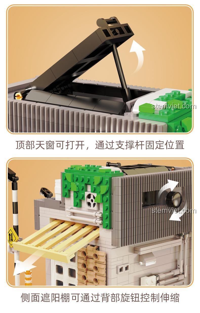 Điều làm nên sự khác biệt của Double Eagle 66007 Mô hình quán cà phê kiểu Nhật không chỉ nằm ở thiết kế đẹp mắt mà còn ở các tính năng tương tác thông minh. Bộ sản phẩm đi kèm một bộ đèn LED sử dụng cổng cắm USB, giúp thắp sáng toàn bộ không gian quán, tạo nên một khung cảnh lung linh, huyền ảo vào ban đêm. Hãy tưởng tượng bạn đặt mô hình này trên bàn làm việc hoặc kệ sách, ánh đèn vàng ấm áp tỏa ra từ quán cà phê sẽ mang lại một cảm giác thật thư giãn. Không chỉ vậy, mô hình còn có nhiều bộ phận có thể chuyển động: cửa chính và cửa hông có thể trượt qua lại, giếng trời trên mái có thể mở ra bằng thanh chống, và đặc biệt là mái hiên bên hông có thể thu vào hoặc kéo ra một cách mượt mà thông qua một núm xoay ẩn phía sau. Những tính năng này không chỉ tăng thêm tính chân thực mà còn mang lại niềm vui khám phá trong quá trình chơi.