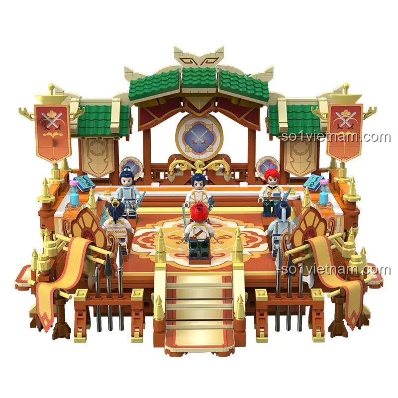 Bộ xếp hình Double Eagle Đấu Trường Lôi Đài Trường An Thành C67007 là một kiệt tác Kiến Trúc Tinh Xảo, được thiết kế với sự tỉ mỉ đến từng chi tiết nhỏ nhất. Với 1683 mảnh ghép, mô hình này tái hiện chân thực một đấu trường cổ trang với mái ngói xanh lá đặc trưng, cột trụ gỗ nâu vững chãi và những bậc thang vàng óng ánh. Từng chi tiết, từ những lá cờ hiệu trang trí đến các họa tiết chạm khắc tinh xảo, đều được chăm chút kỹ lưỡng, mang đậm phong cách kiến trúc Trung Hoa cổ điển. Kích thước mô hình sau khi hoàn thành là 45x31x28.3 cm, tạo nên một tác phẩm trưng bày ấn tượng, thu hút mọi ánh nhìn. Màu sắc chủ đạo là Đỏ, Vàng, Xanh lá và Nâu, tạo nên một tổng thể hài hòa và sống động, phản ánh đúng tinh thần của một đấu trường lôi đài hoành tráng. Đặc biệt, bộ đồ chơi mô hình Lôi Đài Phong Cách Trung Hoa này còn đi kèm 6 minifigures với trang phục và vũ khí như Kiếm, Đao, Cờ hiệu, sẵn sàng cho những trận đấu nảy lửa.