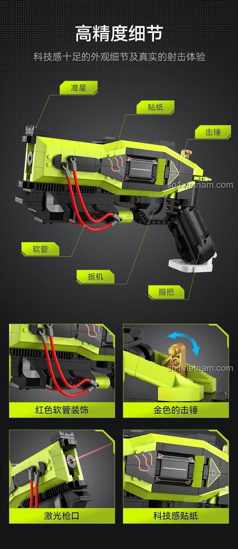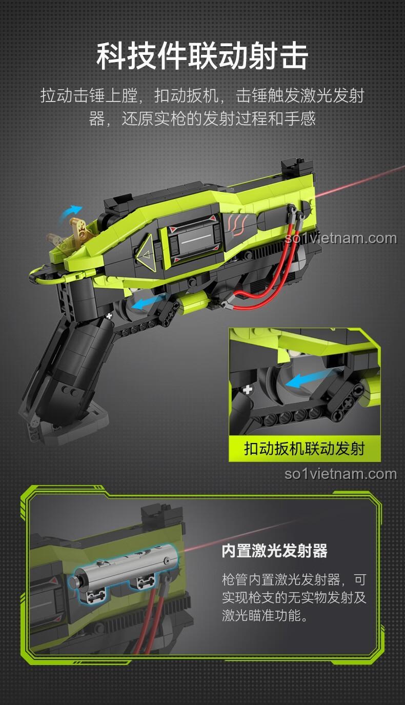 • Cơ chế Hoạt động Tinh vi: Cơ chế cò súng, bộ phận nạp đạn, và bộ phận phát tia laser được thiết kế tỉ mỉ, tái hiện chân thực quy trình hoạt động của một khẩu súng laser.
