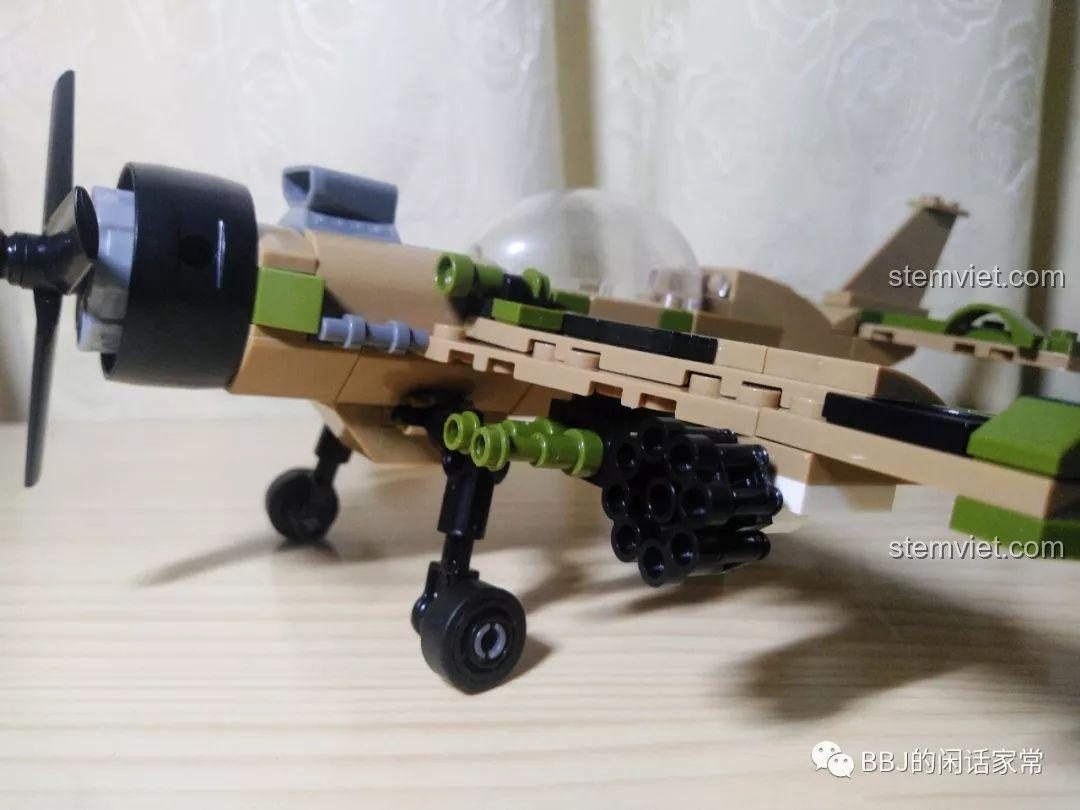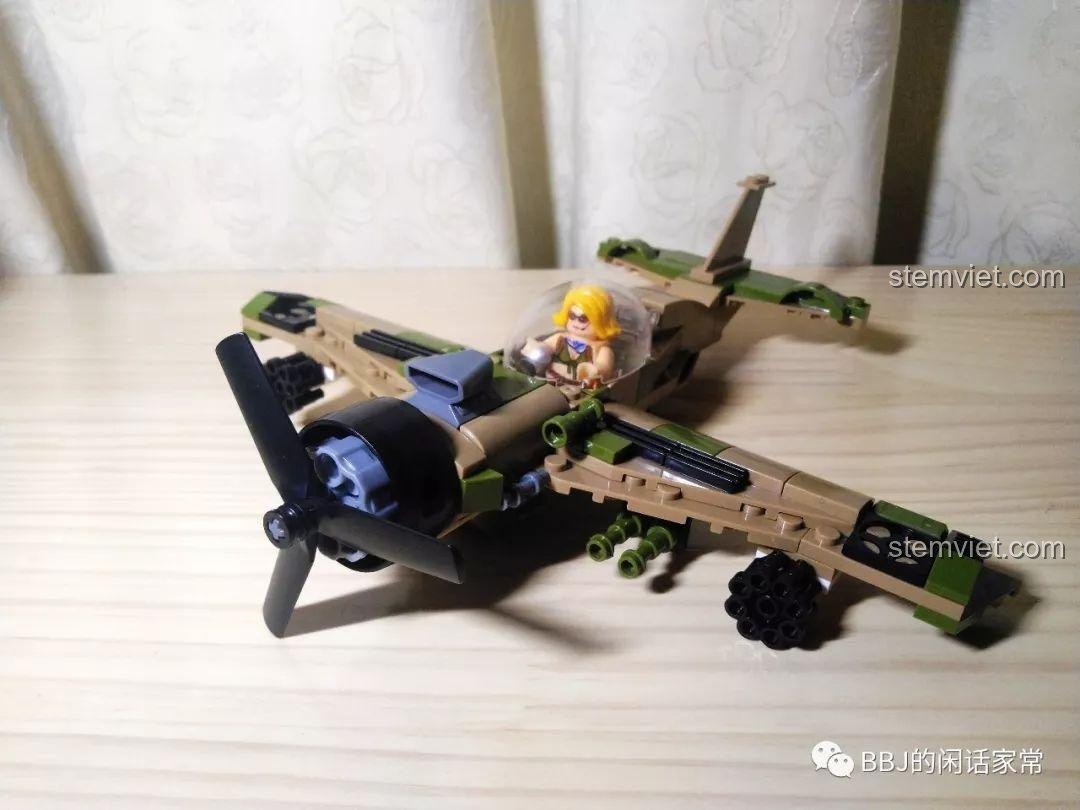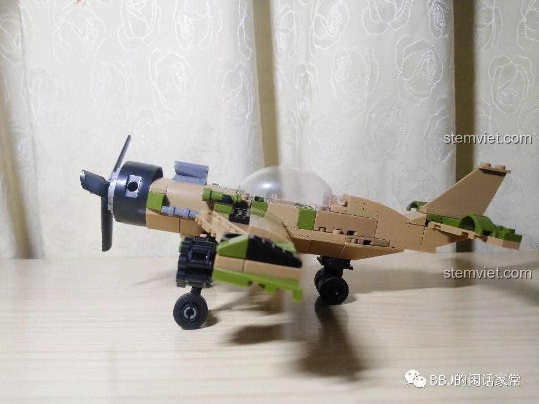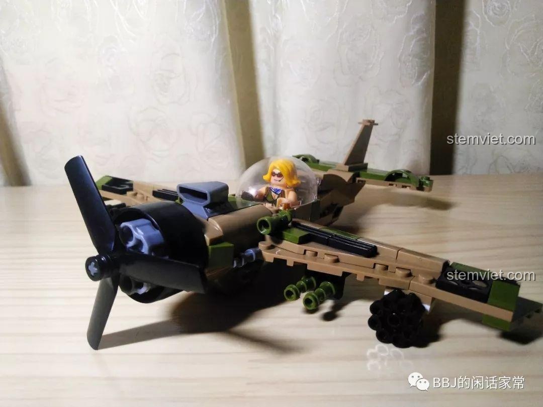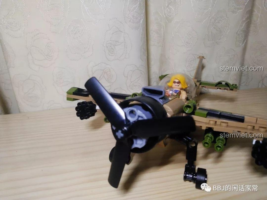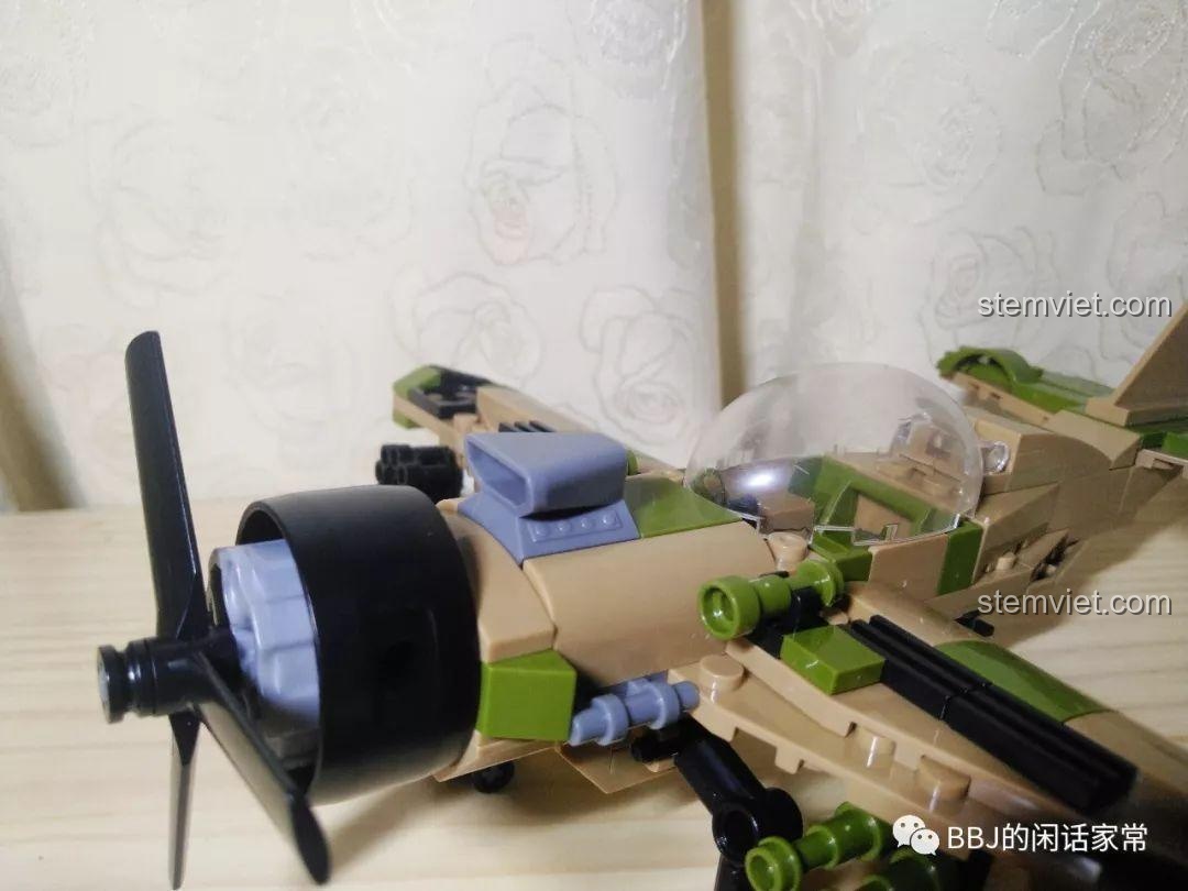 Ngay từ cái nhìn đầu tiên, mô hình máy bay CAYI 2205 đã gây ấn tượng mạnh mẽ với thiết kế đậm chất quân sự. Sự kết hợp giữa hai màu sắc chủ đạo là nâu sa mạc và xanh lá rằn ri tạo nên một vẻ ngoài vừa cổ điển, vừa mạnh mẽ, sẵn sàng cho mọi trận không chiến. Từng chi tiết nhỏ đều được chăm chút, từ cánh quạt lớn phía trước, buồng lái trong suốt có thể mở ra, cho đến hệ thống vũ khí được trang bị đầy đủ dưới hai bên cánh. Đặc biệt, bộ sản phẩm còn đi kèm một minifigure nữ phi công cực ngầu với mái tóc vàng, kính phi công và bộ trang phục cá tính. Nhân vật này không chỉ làm tăng thêm tính chân thực cho mô hình mà còn là người bạn đồng hành cùng bé trong mọi kịch bản chơi, giúp câu chuyện của bé trở nên sống động và hấp dẫn hơn bao giờ hết.