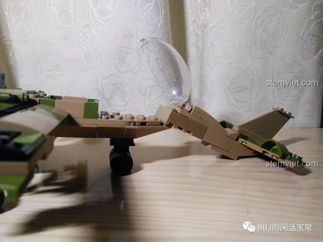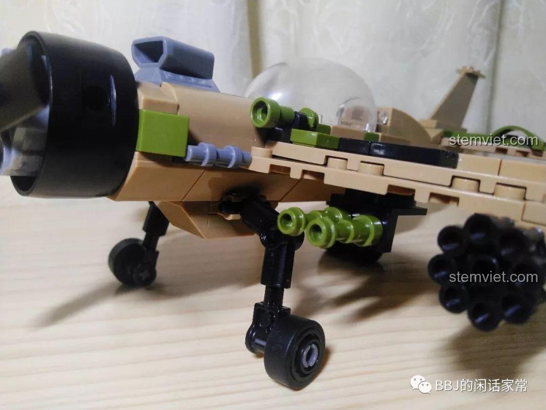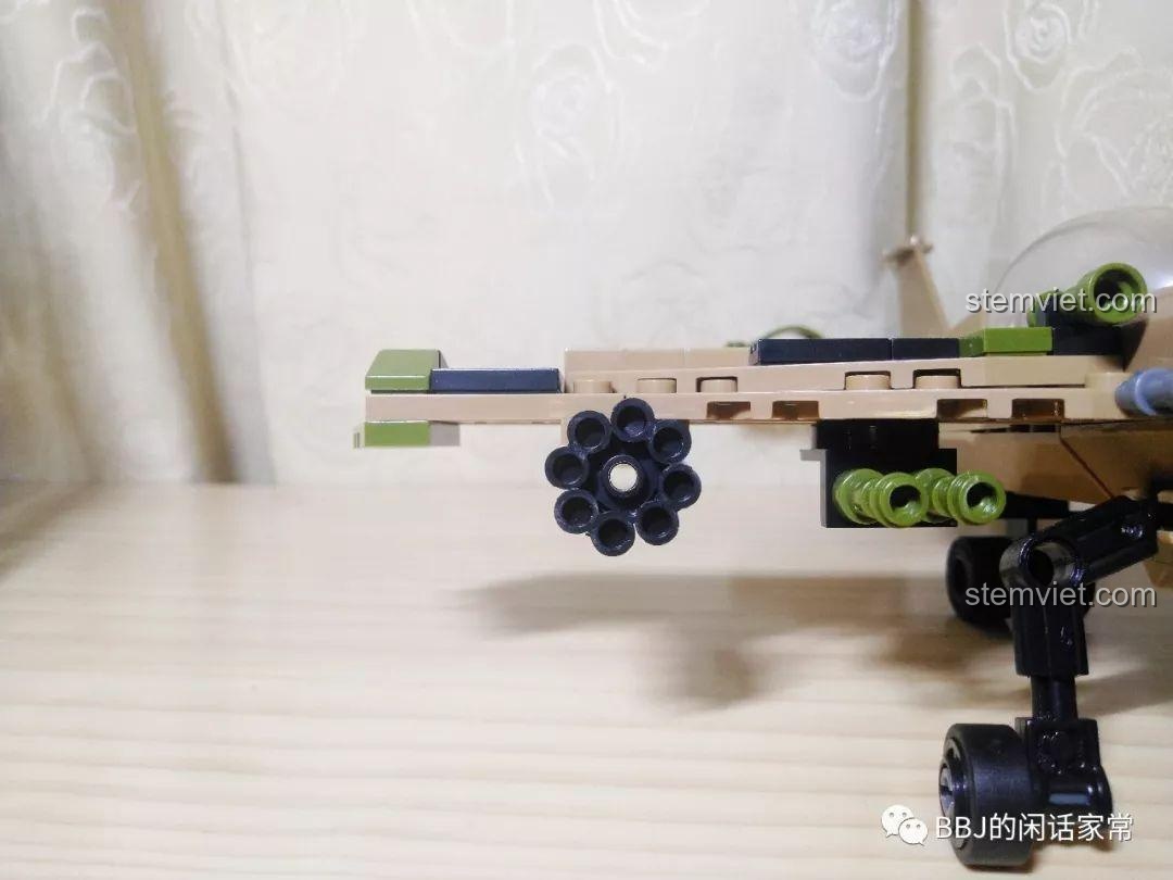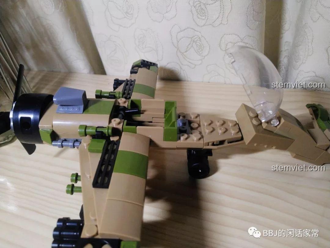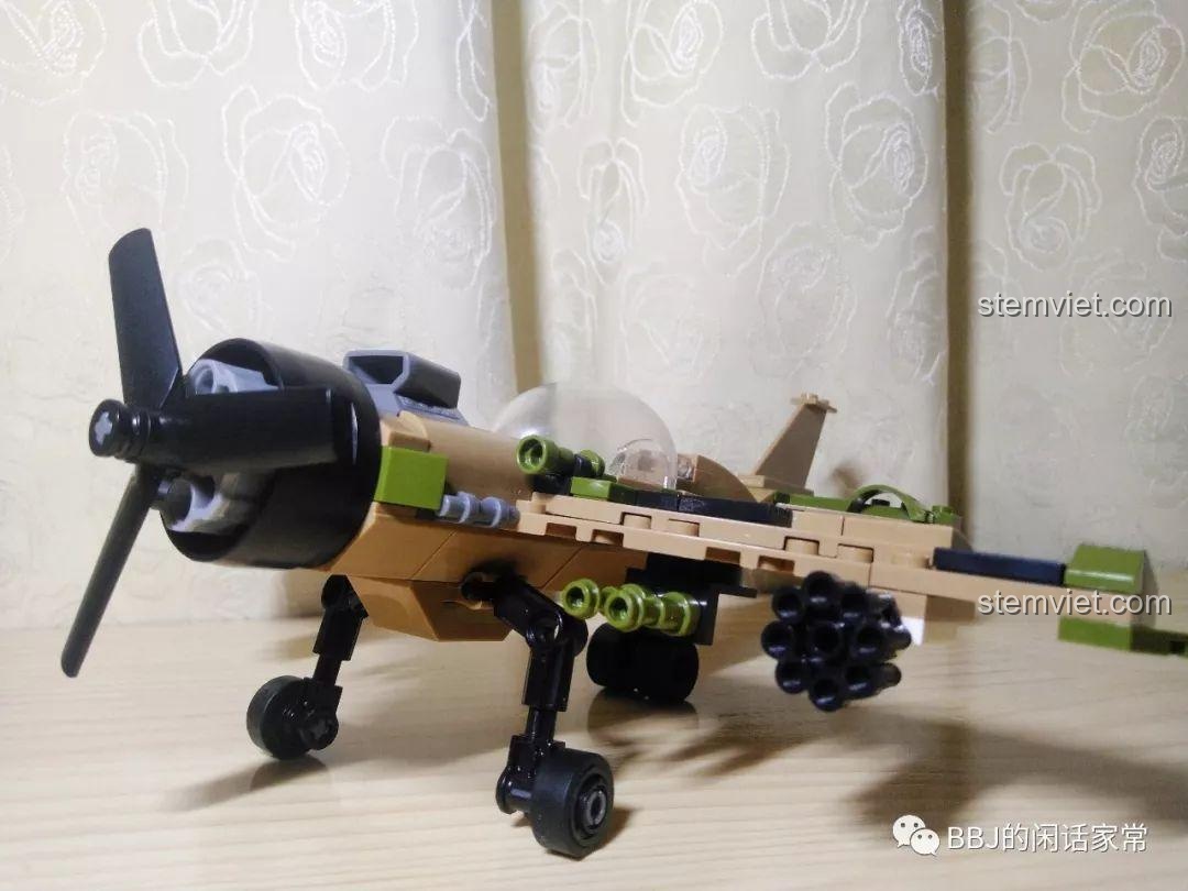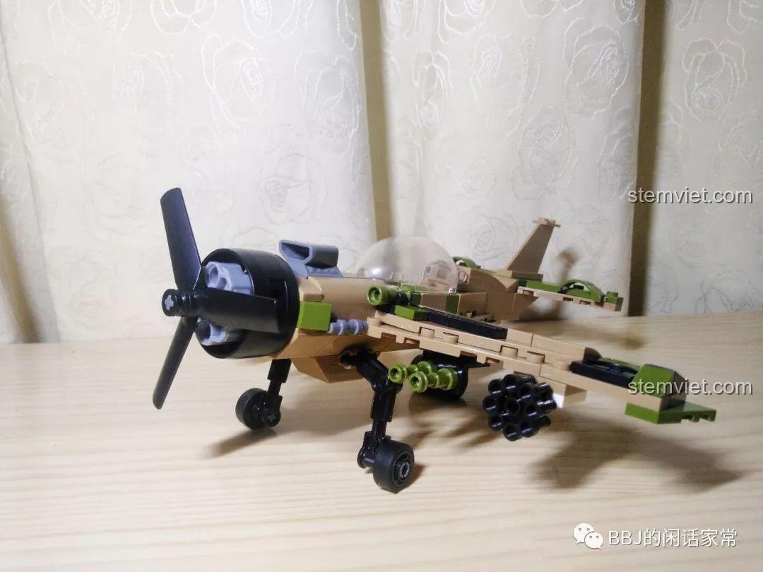 Ngay từ cái nhìn đầu tiên, mô hình máy bay CAYI 2205 đã gây ấn tượng mạnh mẽ với thiết kế đậm chất quân sự. Sự kết hợp giữa hai màu sắc chủ đạo là nâu sa mạc và xanh lá rằn ri tạo nên một vẻ ngoài vừa cổ điển, vừa mạnh mẽ, sẵn sàng cho mọi trận không chiến. Từng chi tiết nhỏ đều được chăm chút, từ cánh quạt lớn phía trước, buồng lái trong suốt có thể mở ra, cho đến hệ thống vũ khí được trang bị đầy đủ dưới hai bên cánh. Đặc biệt, bộ sản phẩm còn đi kèm một minifigure nữ phi công cực ngầu với mái tóc vàng, kính phi công và bộ trang phục cá tính. Nhân vật này không chỉ làm tăng thêm tính chân thực cho mô hình mà còn là người bạn đồng hành cùng bé trong mọi kịch bản chơi, giúp câu chuyện của bé trở nên sống động và hấp dẫn hơn bao giờ hết.
