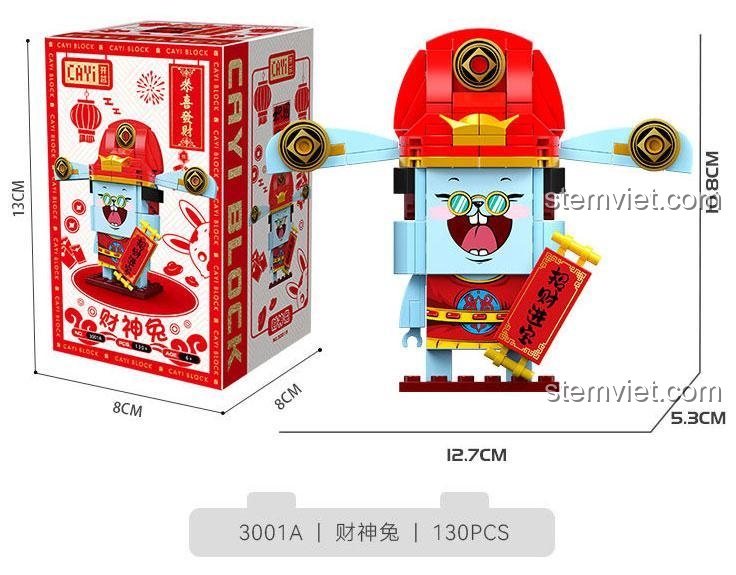 Ngay từ cái nhìn đầu tiên, bộ xếp hình 3001A chắc chắn sẽ chinh phục cả mẹ và bé bởi thiết kế theo phong cách BrickHeadz cực kỳ ngộ nghĩnh và hiện đại. Chú Thỏ Thần Tài được tạo hình với đôi mắt to tròn, chiếc mũ Thần Tài đặc trưng và nụ cười tươi rói, tay cầm một câu đối đỏ với dòng chữ “Cung Hỷ Phát Tài” – một lời chúc năm mới không thể quen thuộc hơn. Các gam màu chủ đạo như đỏ, vàng, xanh lơ được phối hợp hài hòa, không chỉ bắt mắt mà còn mang đậm không khí lễ hội, tượng trưng cho may mắn, tài lộc và hy vọng. Với kích thước sau khi lắp ráp là 12.7cm dài, 5.3cm rộng và 10.8cm cao, mô hình Thỏ Chiêu Tài CAYI có kích thước vừa vặn, hoàn hảo để trưng bày trên bàn học của bé, kệ sách hay phòng khách, mang không khí xuân rộn ràng đến mọi ngóc ngách trong nhà. Từng chi tiết nhỏ đều được chăm chút tỉ mỉ, tạo nên một tổng thể đáng yêu không thể cưỡng lại.