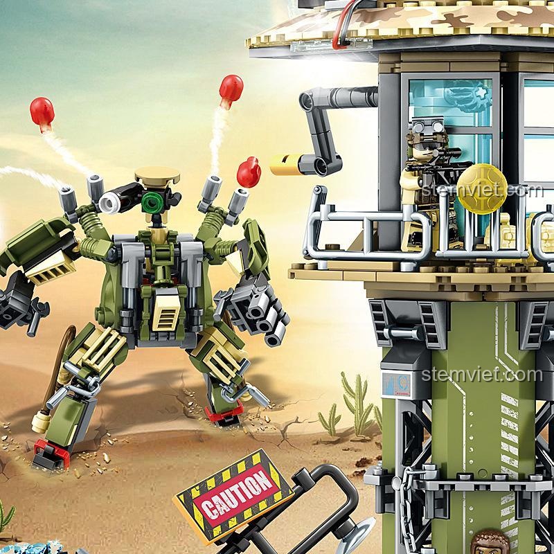 Ngay từ cái nhìn đầu tiên, bộ xếp hình 11717 đã chinh phục mọi cậu bé bởi sự hoành tráng và chi tiết. Mô hình bao gồm một tháp canh quân sự 2 tầng kiên cố, được thiết kế với tông màu xanh quân đội và vàng cát sa mạc, tạo cảm giác chân thực như một tiền đồn giữa chiến trường. Từng chi tiết nhỏ như hàng rào, thang leo, biển báo ‘STOP’, và đặc biệt là khẩu súng máy hạng nặng trên đỉnh tháp đều được tái hiện tỉ mỉ. Nhưng ngôi sao của bộ sản phẩm chính là cỗ máy chiến đấu mecha ‘Sơn Hổ’ (山虎). Với dáng vẻ hầm hố, các khớp nối linh hoạt và hệ thống vũ khí tận răng, robot này sẵn sàng xung trận bất cứ lúc nào. Bên cạnh đó, bộ đồ chơi còn đi kèm một chiếc mô tô địa hình, 4 minifigures lính đặc nhiệm với biểu cảm và trang bị khác nhau, cùng vô số phụ kiện như hòm đạn, rào chắn… tạo nên một sa bàn chiến đấu sống động và đầy đủ, sẵn sàng cho mọi kịch bản mà bé nghĩ ra.