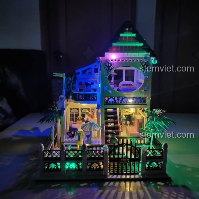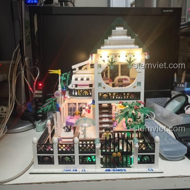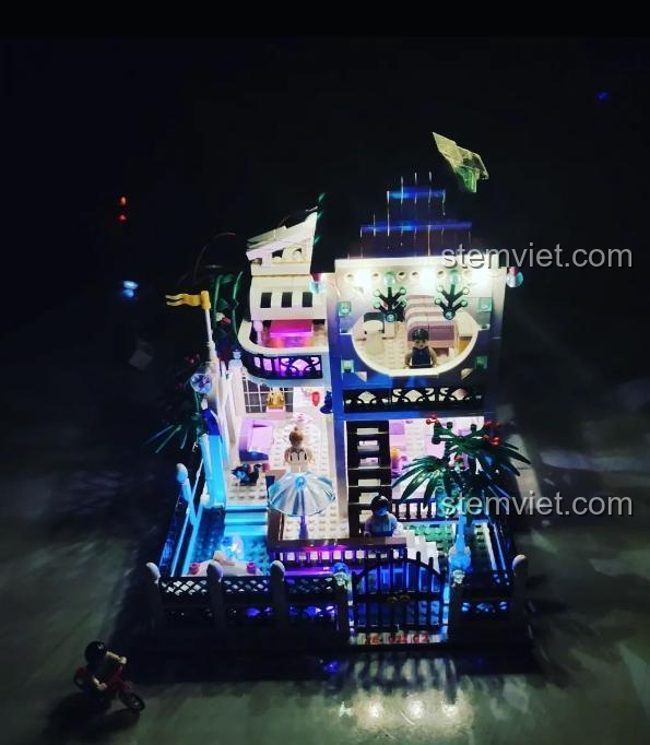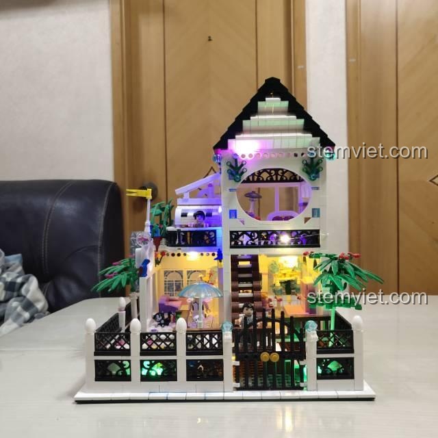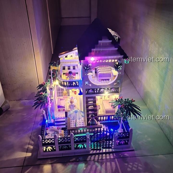 Điều làm nên sự khác biệt và biến Biệt Thự Sang Trọng 01202 trở thành một vật phẩm trang trí đắt giá chính là hệ thống đèn LED đi kèm. Chỉ với một thao tác cắm dây vào cổng USB, cả ngôi biệt thự sẽ bừng sáng lung linh, huyền ảo. Ánh đèn vàng ấm áp lan tỏa từ các căn phòng, phản chiếu xuống mặt hồ bơi trong xanh, tạo nên một khung cảnh về đêm không thể lãng mạn hơn. Đây không chỉ là một tính năng, mà là một trải nghiệm cảm xúc, biến mô hình tĩnh thành một không gian sống động, có hồn. Ngoài ra, bộ sản phẩm còn đi kèm 4 minifigures gia đình (bố, mẹ, và hai con), cho phép bạn thỏa sức sáng tạo nên những câu chuyện gia đình ấm áp, hạnh phúc trong chính ngôi nhà mơ ước mà mình đã tự tay xây dựng.