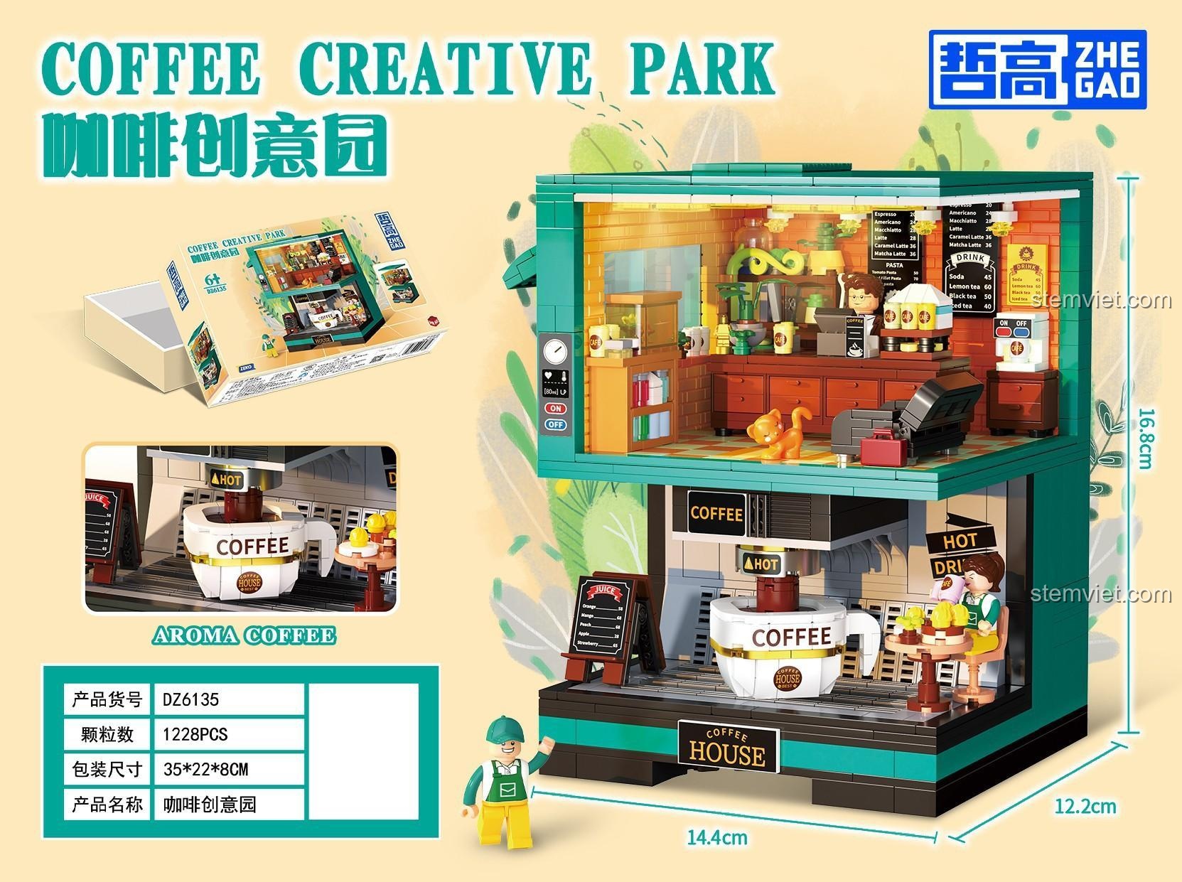 Điều làm nên sự khác biệt của bộ ZHEGAO DZ6135 chính là sự chăm chút đến từng chi tiết nhỏ nhất. Với 1228 mảnh ghép mini block, mô hình quán cà phê hiện lên sống động và chân thực đến bất ngờ. Toàn bộ công trình được thiết kế theo dạng mở, cho phép bé và cả gia đình dễ dàng chiêm ngưỡng và tương tác với không gian nội thất bên trong. Tầng một là khu vực quầy bar sầm uất với máy pha cà phê, tủ bánh, và menu đồ uống chi tiết. Tầng hai là không gian thưởng thức cà phê ấm cúng với bàn ghế, đèn trang trí và những chậu cây xanh mướt. Tông màu chủ đạo xanh lá, nâu và xám kết hợp hài hòa, tạo nên một vẻ ngoài vừa cổ điển vừa hiện đại, cực kỳ bắt mắt. Kích thước sau khi hoàn thành là 14.4 x 12.2 x 16.8 cm, một kích thước hoàn hảo để trưng bày trong phòng của bé, trở thành một vật trang trí độc đáo và đầy ý nghĩa.