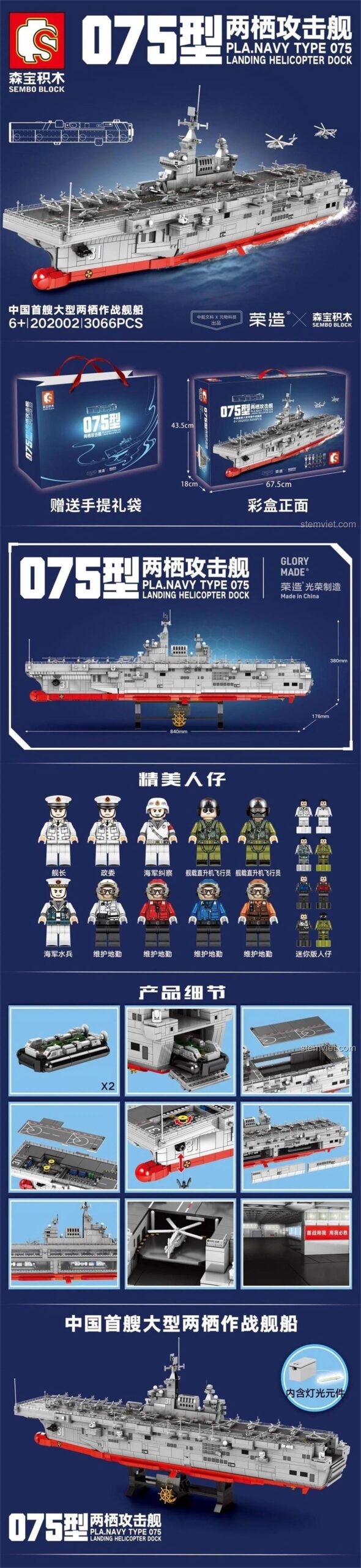 Có Đèn LED & Nội Thất Chi Tiết: Khám Phá Bộ Lắp Ráp SEMBO 202002 Tàu Tấn Công Đổ Bộ Type 075 Hải Nam (3066 mảnh ghép)