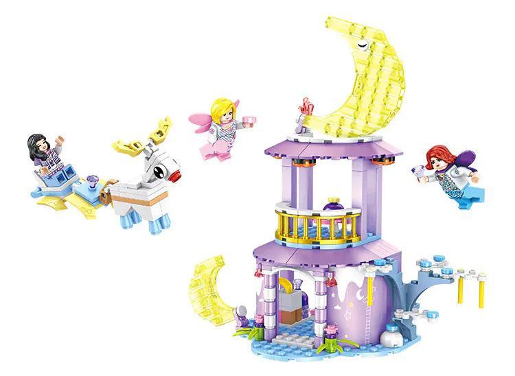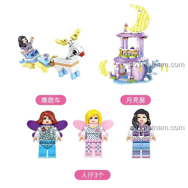 Vẻ đẹp của đồ chơi mô hình FC3505 nằm ở thiết kế tinh tế và đầy mộng mơ, tái hiện hoàn hảo một thế giới cổ tích nhiệm màu. Tòa lâu đài được xây dựng với tông màu chủ đạo là tím pastel, hồng ngọt ngào và xanh lơ dịu mát, điểm xuyết bởi sắc vàng óng ả của những chi tiết trang trí. Điểm nhấn ấn tượng nhất chính là biểu tượng mặt trăng khuyết khổng lồ được tạo nên từ những mảnh ghép màu vàng trong suốt, lấp lánh dưới ánh đèn, tạo cảm giác huyền ảo như đang ở trên cung trăng thực sự. Từng chi tiết nhỏ như ban công, cửa sổ, hay những bông hoa trang trí đều được chăm chút tỉ mỉ, khơi gợi trí tưởng tượng phong phú của trẻ. Bên cạnh tòa lâu đài chính, bộ sản phẩm còn đi kèm một cỗ xe tuần lộc màu trắng tinh khôi với cặp sừng vàng, sẵn sàng đưa ba nàng tiên xinh đẹp đi khám phá vương quốc thần tiên. Ba nhân vật minifigure, mỗi người một vẻ với mái tóc và trang phục khác nhau, cùng đôi cánh lấp lánh, sẽ là những nhân vật chính trong vô vàn câu chuyện do chính bé tạo ra.