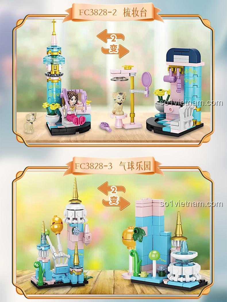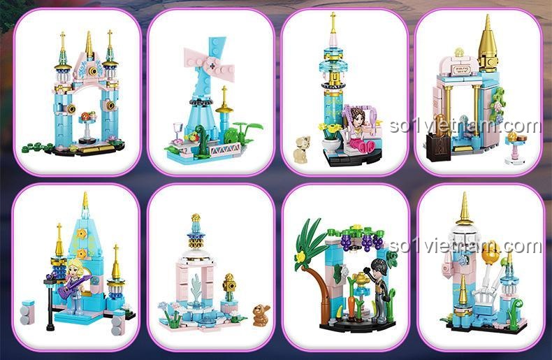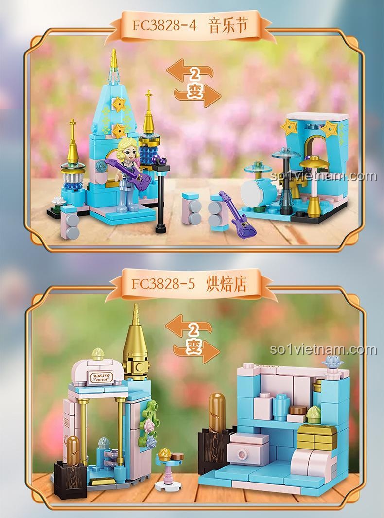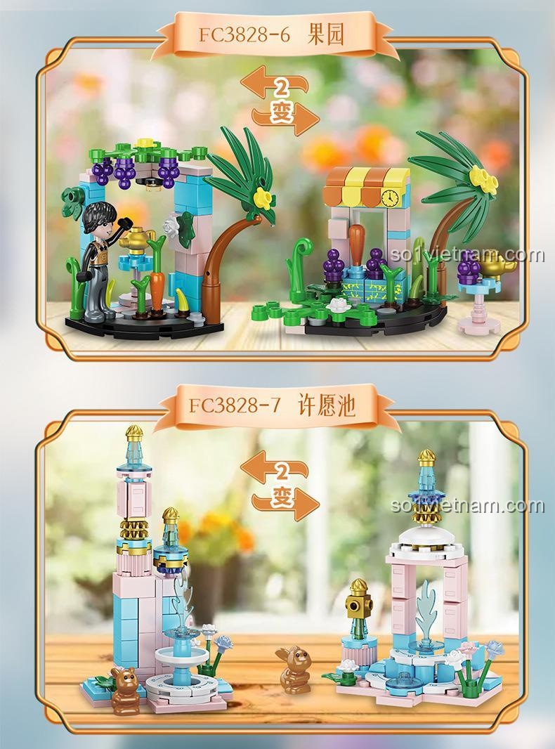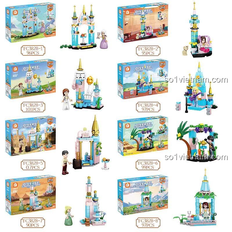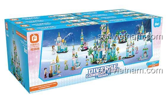 Điểm nhấn nổi bật và độc đáo nhất của Forange FC3828 chính là khả năng biến hóa “17 trong 1”. Bộ sản phẩm bao gồm 8 hộp nhỏ, mỗi hộp là một câu chuyện riêng. Điều kỳ diệu là, mỗi hộp nhỏ này lại có thể lắp ráp thành 2 mô hình khác nhau! Bé có thể tạo ra một buổi tiệc sinh nhật, một bàn trang điểm lộng lẫy, một sân khấu âm nhạc sôi động, hay một giếng ước nguyện linh thiêng… Nhưng đó chưa phải là tất cả! Khi tập hợp đủ 782 mảnh ghép từ cả 8 hộp, một thử thách lớn hơn và thú vị hơn đang chờ đợi: xây dựng nên một Lâu Đài Hoàng Gia Mộng Mơ nguy nga, tráng lệ. Quá trình này không chỉ là lắp ghép, mà là một cuộc phiêu lưu thực sự, giúp bé rèn luyện sự kiên nhẫn, khả năng đọc hiểu sách hướng dẫn và giải quyết vấn đề. Cùng với 8 nhân vật công chúa, hoàng tử đi kèm, bé có thể thỏa sức sáng tạo vô vàn kịch bản và câu chuyện khác nhau.