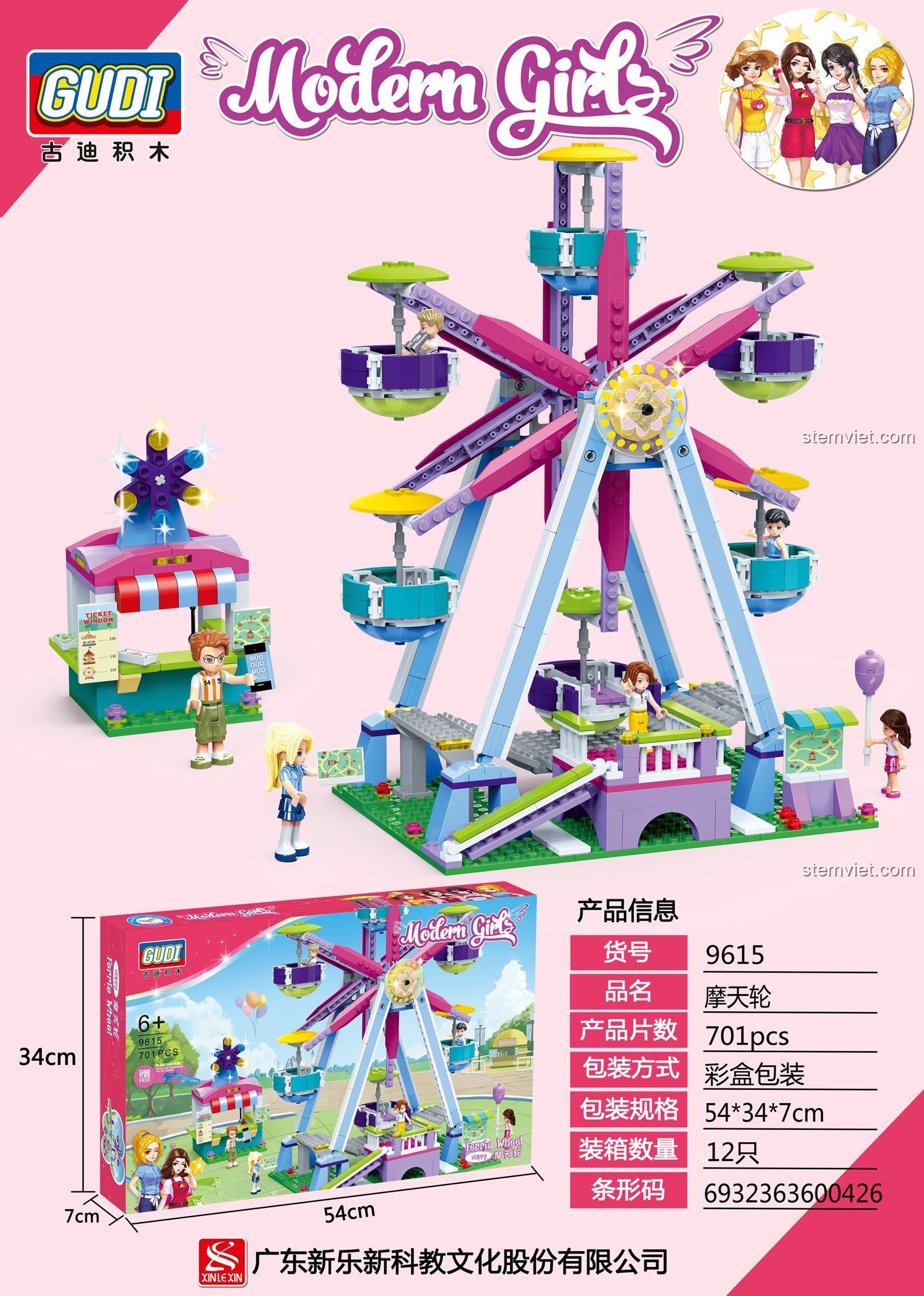 Mẹ có nhớ cảm giác háo hức khi lần đầu tiên nhìn thấy một vòng đu quay khổng lồ, lấp lánh ánh đèn không? Cái cảm giác hồi hộp khi cabin từ từ lên cao, mở ra cả một thế giới rực rỡ bên dưới. Giờ đây, mẹ có thể mang cả một công viên giải trí thu nhỏ về nhà cho cô công chúa nhỏ 6 tuổi của mình với bộ đồ chơi GUDI 9615 Vòng Quay Mặt Trời Modern Girls. Đây không chỉ là một món đồ chơi, mà là cánh cửa mở ra thế giới của tình bạn, của những câu chuyện phiêu lưu đầy màu sắc trong thế giới ‘Modern Girls’. Mỗi mảnh ghép là một bước để bé xây dựng nên Vòng Quay Kỳ Diệu của riêng mình, nơi những giấc mơ tuổi thơ được chắp cánh bay cao. Hãy cùng bé tạo nên những ký ức ngọt ngào, xây dựng nên những công trình của trí tưởng tượng và niềm vui bất tận.