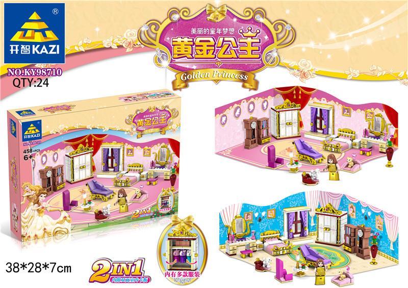 Ngay từ cái nhìn đầu tiên, đồ chơi xếp hình Phòng ngủ công chúa KY98710 đã chinh phục mọi bé gái bởi tông màu hồng phấn và tím oải hương ngọt ngào, điểm xuyết những chi tiết vàng kim sang trọng, đúng chuẩn phong cách hoàng gia. Với 458 mảnh ghép được thiết kế tỉ mỉ, bé có thể tạo ra một không gian sống động đến từng chi tiết: chiếc giường công chúa êm ái với đầu giường chạm khắc tinh xảo, bàn trang điểm kiêu kỳ với gương soi lấp lánh, tủ quần áo lớn chứa đựng những bộ váy áo dạ hội, và cả chiếc ghế dài thư giãn đầy quý phái. Điểm độc đáo nhất của Bộ lắp ráp phòng công chúa KAZI chính là khả năng biến hóa 2 trong 1. Chỉ với cùng một bộ mảnh ghép, bé có thể sáng tạo nên hai không gian hoàn toàn khác biệt: một là phòng ngủ ấm cúng, hai là phòng khách sang trọng để tiếp đón hoàng tử. Sự linh hoạt này không chỉ nhân đôi niềm vui mà còn khuyến khích bé không ngừng tư duy, sắp xếp lại không gian, tạo ra vô vàn kịch bản mới mẻ.