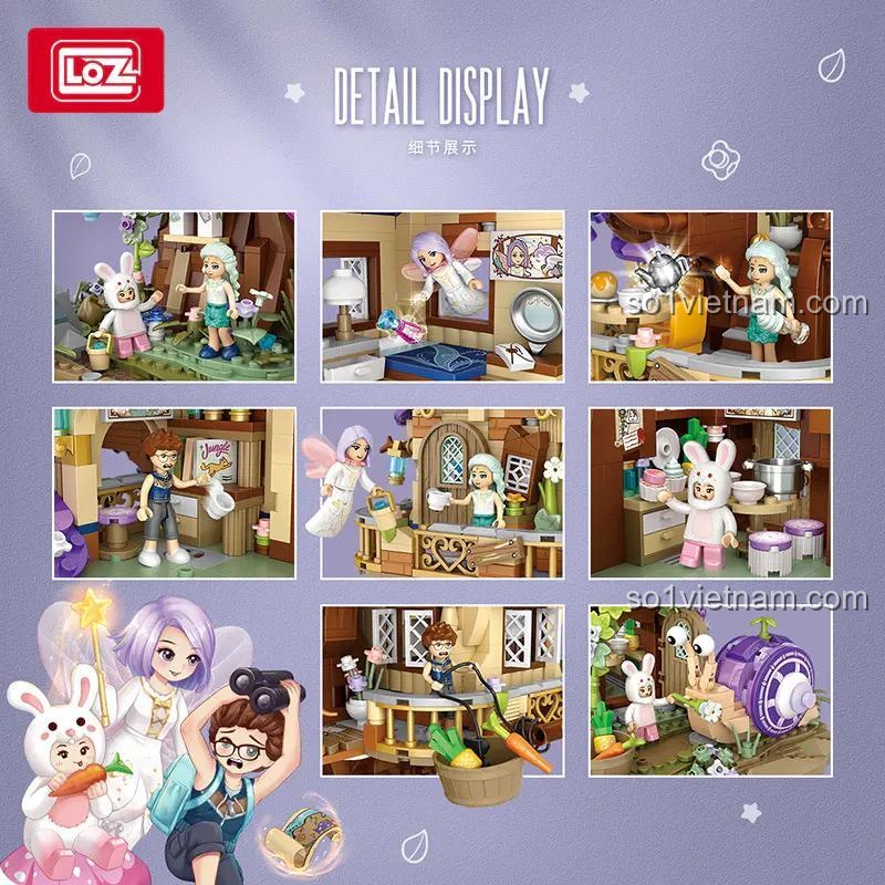 Bộ lắp ghép Lâu Đài Cây Cổ Tích LOZ không chỉ là một mô hình tĩnh để trưng bày. Đây là một sân khấu sống động cho những câu chuyện thần tiên. Bé có thể mở các phần của ngôi nhà để dễ dàng chơi đùa và sắp xếp nội thất bên trong. Bộ sản phẩm đi kèm với 5 nhân vật đáng yêu: hai nàng tiên, một cô bé, một cậu bé và một người bạn trong trang phục thỏ ngộ nghĩnh, cùng với chú ngựa một sừng và nhiều sinh vật nhỏ khác. Bé có thể cho các nhân vật trượt cầu thang dây leo, chăm sóc khu vườn, tổ chức tiệc trà trên ban công, hay cùng nhau khám phá những căn phòng bí mật. Mỗi chi tiết nhỏ như chiếc xích đu, giỏ rau củ, hay những lọ thuốc phép đều góp phần làm cho trải nghiệm chơi của bé thêm phần phong phú và chân thực. Đây là một sân chơi không giới hạn cho trí tưởng tượng của trẻ.