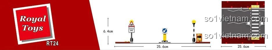 Ngay từ cái nhìn đầu tiên, bộ sản phẩm đã gây ấn tượng mạnh mẽ với sự tỉ mỉ và chân thực. Trên một tấm đế (baseplate) vuông vức kích thước 25.6 x 25.6 cm, cả một không gian đô thị thu nhỏ được tái hiện sống động. Phần lòng đường màu xám được kẻ những vạch trắng đứt đoạn và vạch liền rõ nét, đặc biệt là vạch ngựa vằn dành cho người đi bộ. Vỉa hè lát gạch đỏ au tạo nên sự tương phản nổi bật, mang lại cảm giác quen thuộc của những con phố sầm uất. Điểm nhấn của Vạch sang đường cho người đi bộ Royal Toys chính là các chi tiết phụ trợ: những trụ đèn tín hiệu màu vàng đặc trưng, biển báo ‘School’ nhắc nhở các phương tiện giảm tốc độ, và cả một chiếc thùng rác màu cam nhỏ xinh. Tất cả các chi tiết, từ màu sắc đến hình dáng, đều được chăm chút kỹ lưỡng để mang lại một mô hình hoàn chỉnh, đẹp mắt và giàu tính giáo dục, sẵn sàng trở thành nền tảng cho một thành phố rộng lớn hơn trong trí tưởng tượng của bé.
