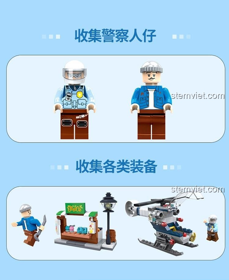 Set đồ chơi Trực thăng tuần tra ZDEL DL10006 đi kèm 2 minifigure: một phi công cảnh sát và một người bán nước, giúp bé có thêm nhiều nhân vật để nhập vai và tạo câu chuyện.
