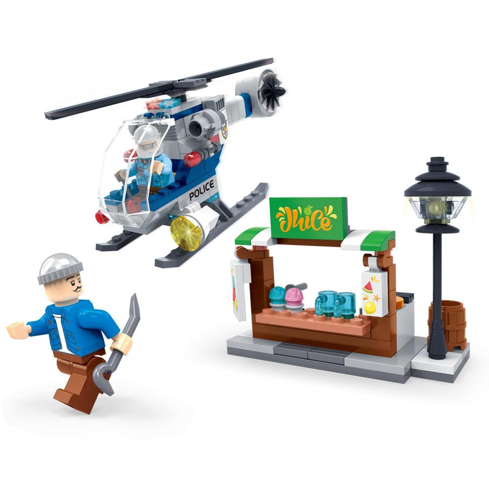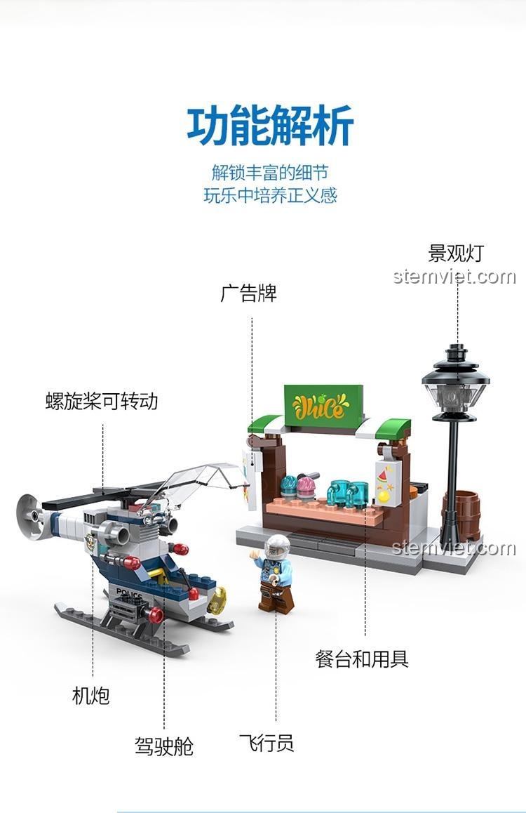 Điểm nhấn của bộ đồ chơi lắp ghép ZDEL này là hai minifigure đi kèm: một phi công cảnh sát dũng cảm và một người bán nước thân thiện, tạo nên một bối cảnh sống động cho các câu chuyện. Chiếc trực thăng được trang bị một khẩu súng máy ở phía trước, tăng thêm tính hành động cho các cuộc truy đuổi. Bên cạnh đó, bộ đồ chơi mô hình 10006 còn có một quầy nước nhỏ với các chi tiết như biển quảng cáo và đèn đường, giúp bé tạo ra nhiều kịch bản chơi đa dạng hơn.