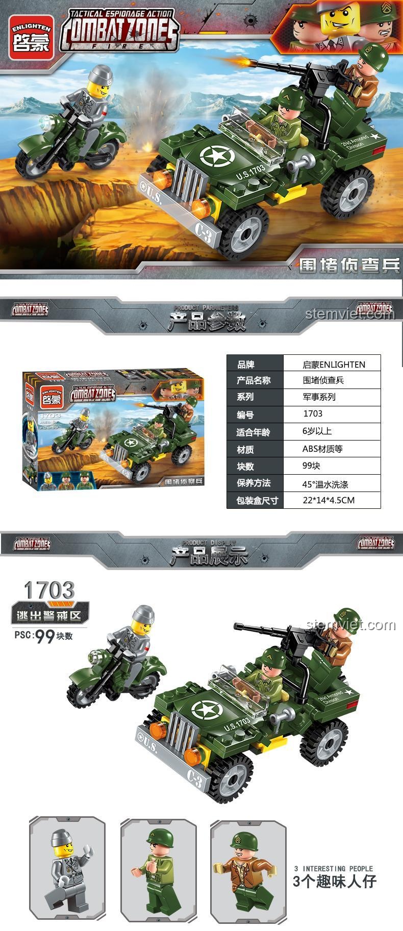 Bộ đồ chơi Enlighten 1703 mang đến chất lượng vượt trội với giá cực tốt. Bạn sẽ nhận được một bộ lắp ráp xe Jeep quân sự và xe mô tô trinh sát chi tiết, bền bỉ, an toàn, và có tính giáo dục cao mà không cần phải chi trả quá nhiều. Đây là lựa chọn tiết kiệm và thông minh cho các bậc phụ huynh muốn mang lại niềm vui và sự phát triển cho con.