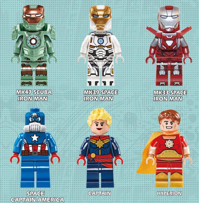 Bộ đồ chơi mô hình Captain Marvel JiSi 0244 bao gồm 6 minifigure siêu anh hùng độc đáo: Iron Man MK47 Scuba, Iron Man MK39 Space, Iron Man MK33 Space, Captain America Space, Captain Marvel và Hyperion. Mỗi nhân vật đều có thiết kế riêng biệt và chi tiết sắc nét, mang đến sự đa dạng cho bộ sưu tập của bé.
