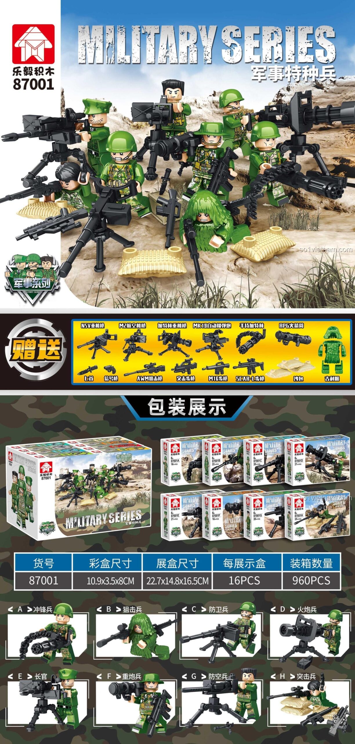 Bộ sản phẩm LeYi 87001 bao gồm một biệt đội đầy đủ 8 lính đặc nhiệm với các vai trò khác nhau như sĩ quan, lính bắn tỉa, lính pháo binh… Mỗi lính đều đi kèm với vũ khí và trang bị đặc trưng, chi tiết, có thể tháo rời và hoán đổi.