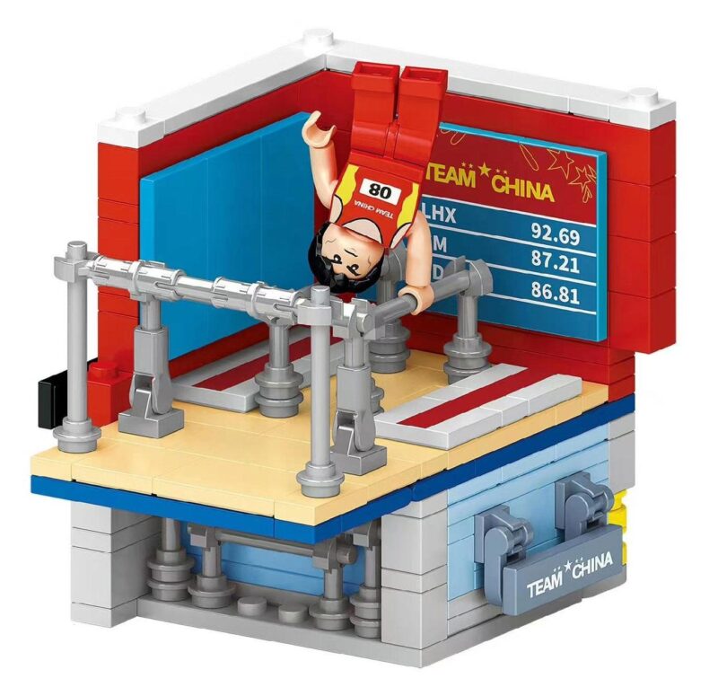 Tâm điểm của mô hình chính là đồ chơi mô hình Vận động viên thể dục dụng cụ đang thực hiện một động tác lộn người trên không đầy kỹ thuật. Từ biểu cảm tập trung trên khuôn mặt, cơ bắp được tạo hình rõ nét, cho đến bộ trang phục thi đấu màu đỏ rực rỡ với dòng chữ ‘TEAM CHINA’ và số 08, tất cả đều được chăm chút để tạo nên một hình ảnh chân thực nhất. Dàn xà kép được thiết kế chắc chắn với màu xám kim loại, đặt trên một bục thi đấu màu gỗ sáng, bên dưới là hệ thống khung đỡ phức tạp, mô phỏng chính xác kết cấu của thiết bị thi đấu thật. Đặc biệt, phía sau là tấm bảng điểm điện tử màu xanh lam, hiển thị các con số điểm số, càng làm tăng thêm kịch tính và không khí của một cuộc tranh tài thực sự. Với kích thước hoàn thiện là 11.2 cm (dài) x 7.9 cm (rộng) x 8.5 cm (cao), mô hình này đủ nhỏ gọn để trưng bày trên bàn học hay kệ sách, nhưng cũng đủ lớn để mọi chi tiết được thể hiện một cách rõ ràng, sắc nét.